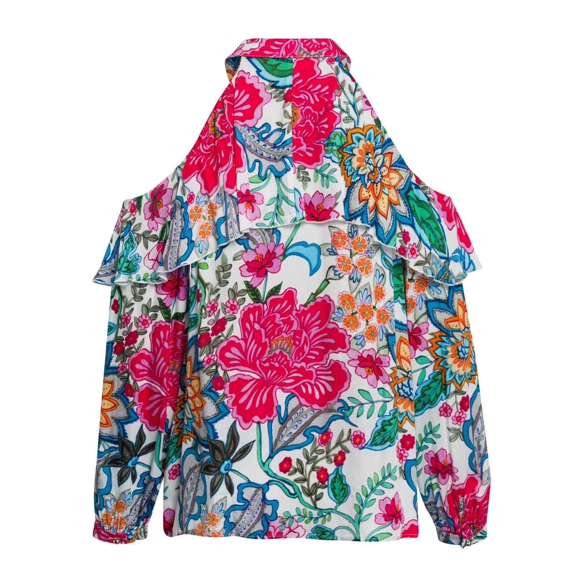 Kleurrijke top van Marc Aurel. Deze top heeft een bloemen print en lange mouwen met open schouders. De top heeft een elegant kraagje en ruches op de voor- en achterzijde.