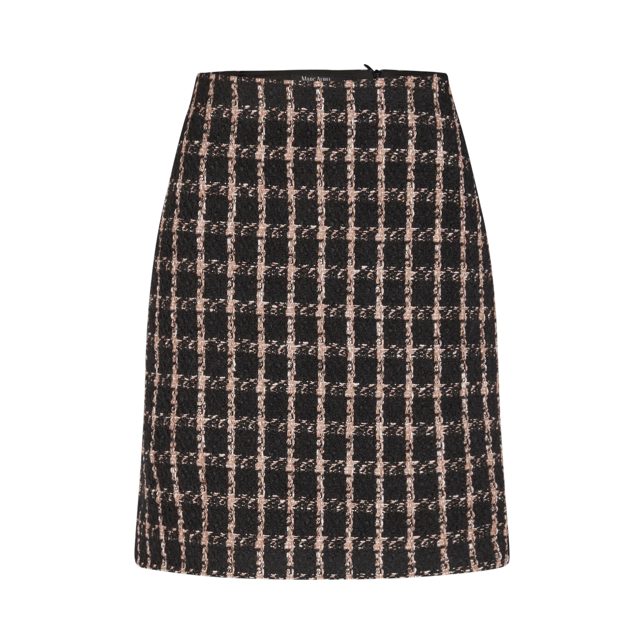 Mini rok van Marc Aurel, model tweed skirt with check pattern. Deze rok is gevoerd en gemaakt van een wol mix met een zwart bruin geruit motief waar een metalic draad doorheen verweven is. De rok sluit met een verborgen ritssluiting aan de achterzijde en heeft een hoge taille.