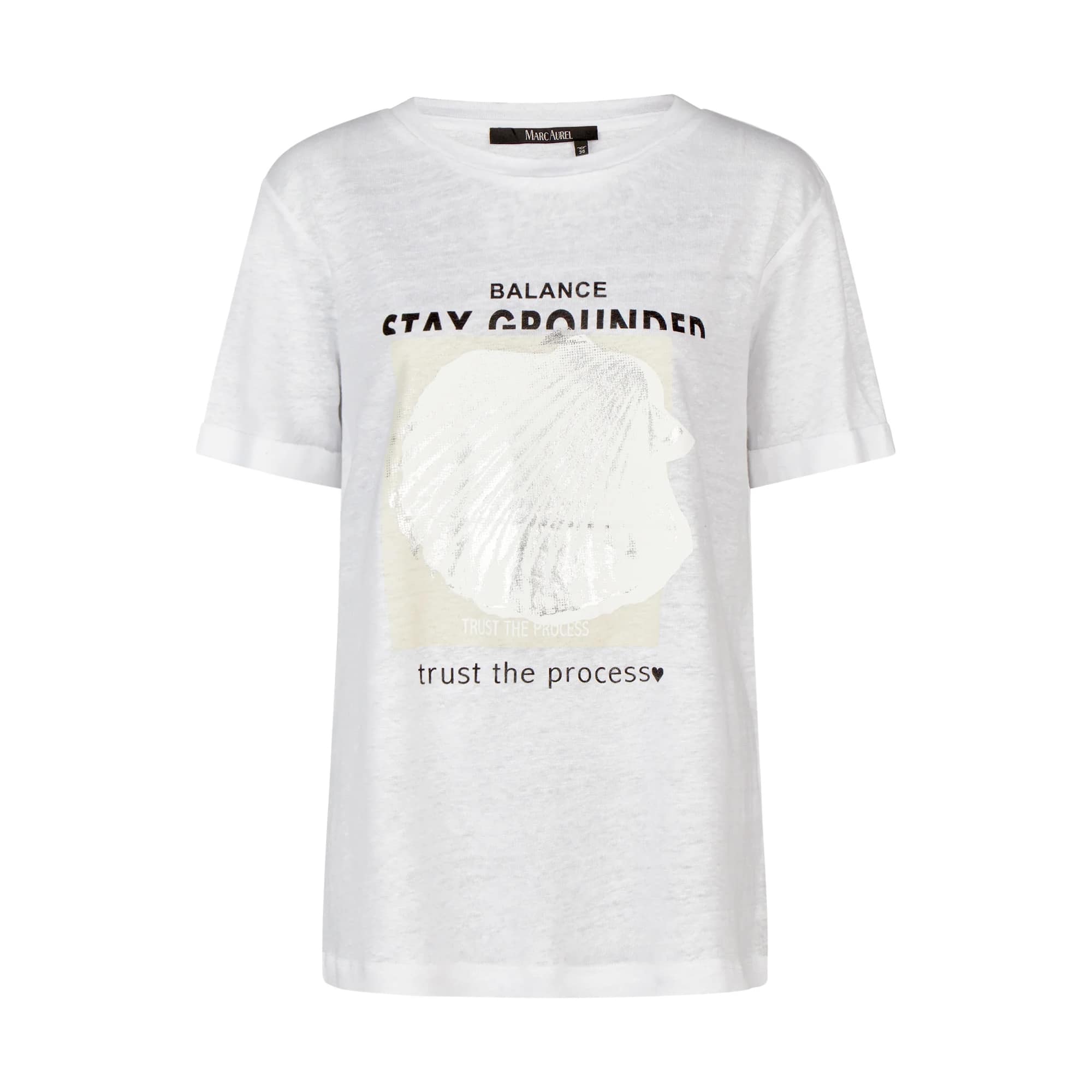 Linnen t-shirt van Marc Aurel, model linen shirt with a summary print. Dit t-shirt is gemaakt van een linnen mix met katoen en heeft een los vallende pasvorm. Het t-shirt heeft een ronde hals, korte mouwen en een print van een schelp in zand met tekst op de voorkant.