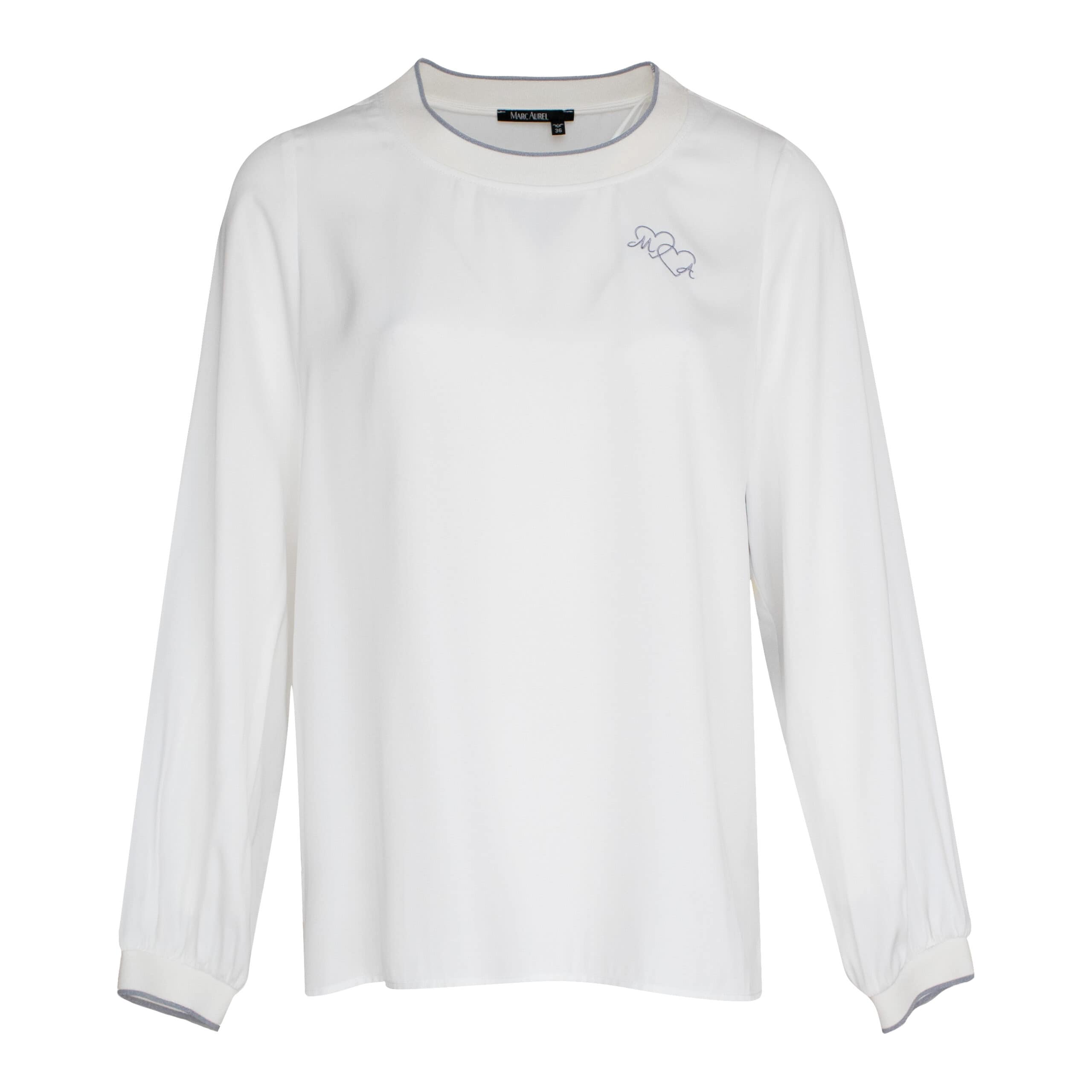 Off white long sleeve shirt van Marc Aurel. Dit shirt is gemaakt van een gladde satijnen stof en heeft een relaxte pasvorm. Het shirt heeft een ronde hals met grijs biesje, lange mouwen en op de voorzijde een hart met de letters A M.