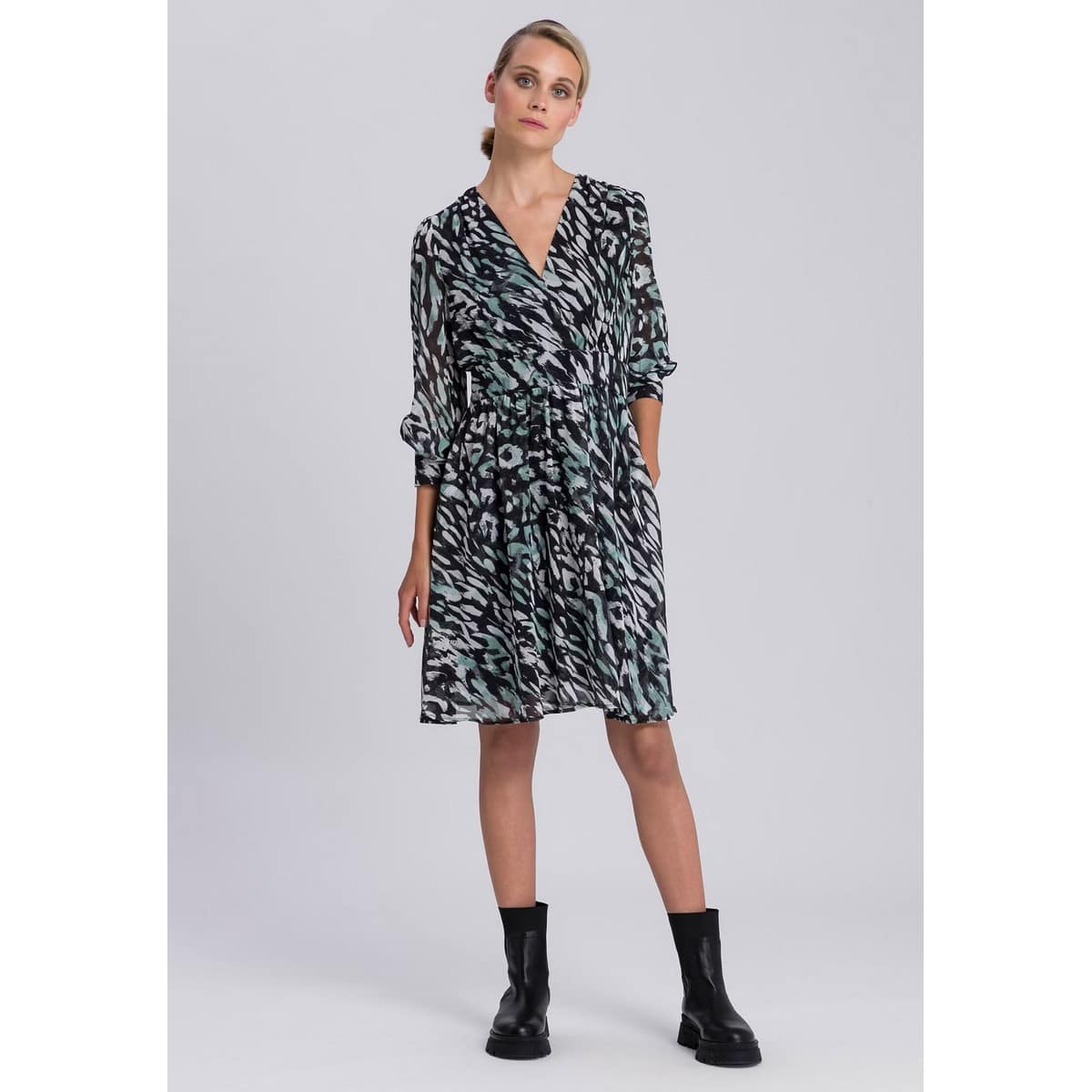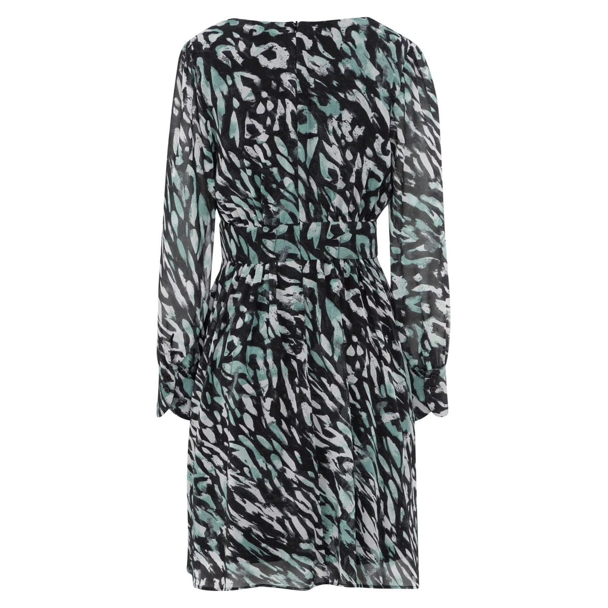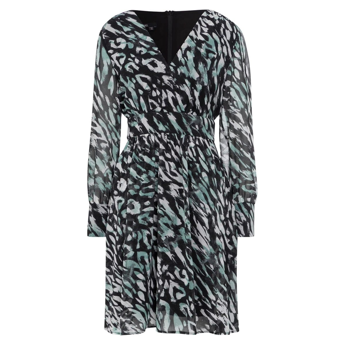 Vrouwelijk kleedje van Marc Aurel. Deze jurk heeft een mooie V-hals met een hoge taille. De jurk heeft een zwarte basis met een allover print in wit met turquoise en sluit met een verborgen ritssluiting aan de achterzijde.
