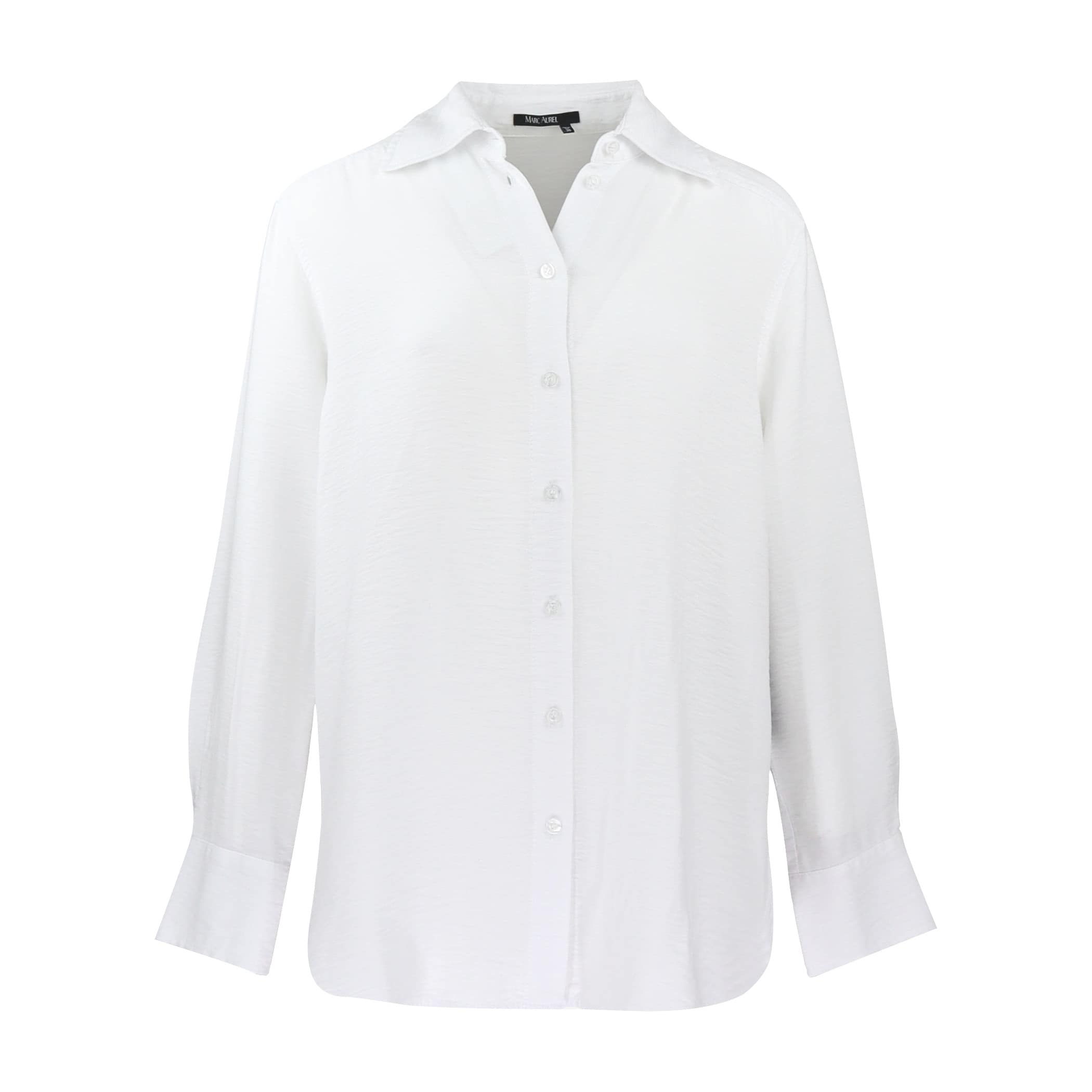 Witte blouse van Marc Aurel. Deze klassieke blouse sluit aan de voorzijde met een knoopsluiting en heeft een losvallende pasvorm. De effen witte blouse valt op de heup en heeft een iets langere achterzijde dan voorzijde.