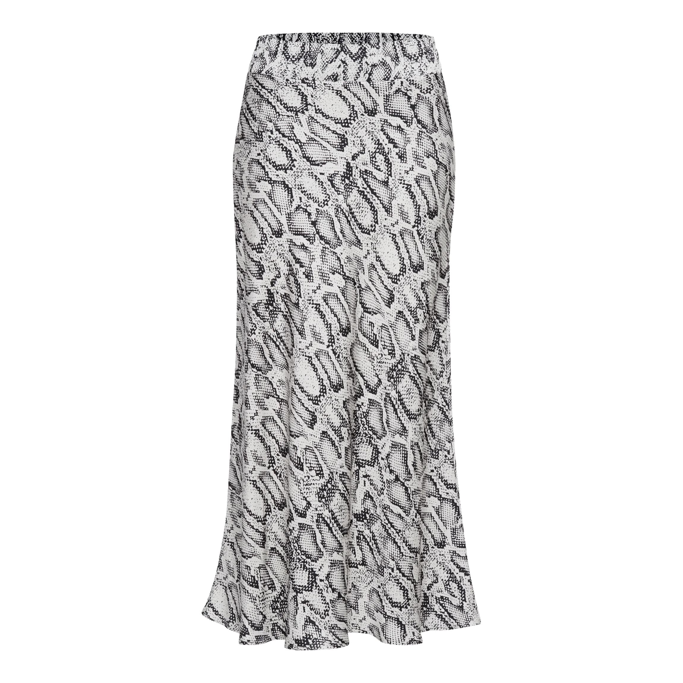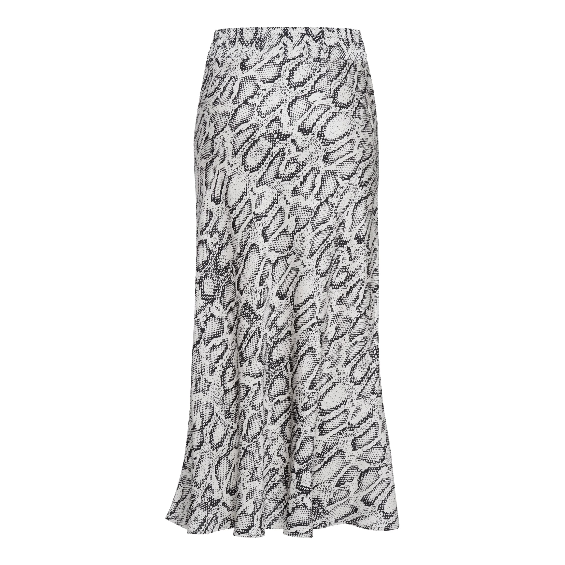 Satijnen maxi rok van Marc Aurel, model skirt with snake print in offwhite black varied. Deze rok is gemaakt van een off white, gladde stof met een dierenprint die schuin loopt. De rok heeft een elastische taille en valt op de enkels.
