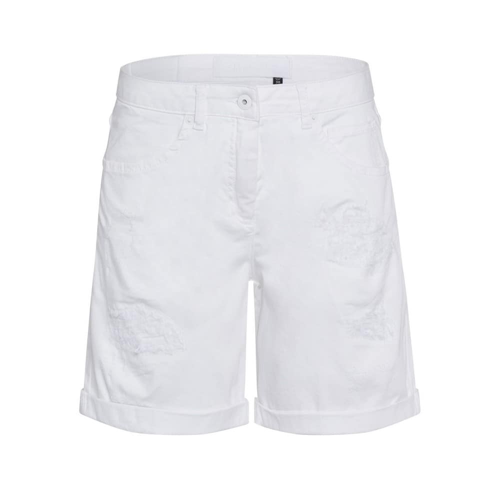 Witte shorts van Marc Aurel. Deze korte broek heeft een losse pasvorm, normale taille en is gemaakt van stretchstof. De shorts sluit met een knoop- en ritssluiting en heeft aan de voorzijde diverse decoratieve beschadigingen. Aan de voorzijde heeft deze korte broek twee steekzakken met aan de achterzijde twee achterzakken.