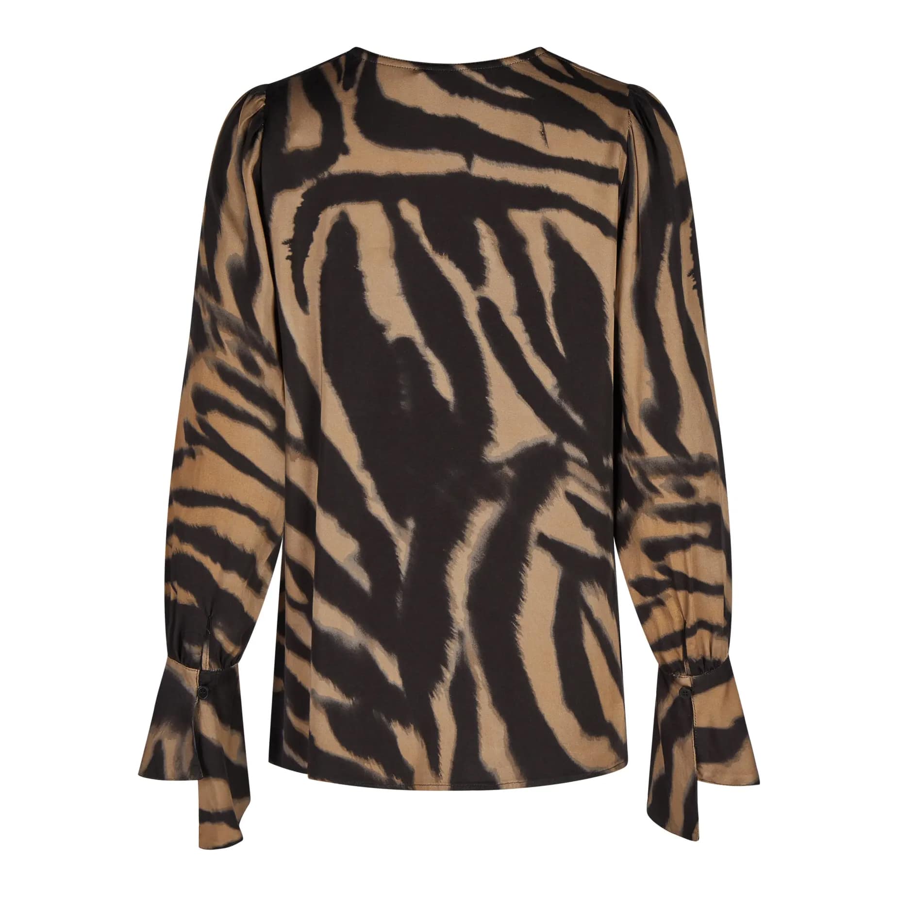 Zwarte blouse met bruine print van Marc Aurel. Deze losvallende blouse is gemaakt van een viscose met een zwart bruine tijgerprint. De blouse heeft een V-hals en lange manchetten.