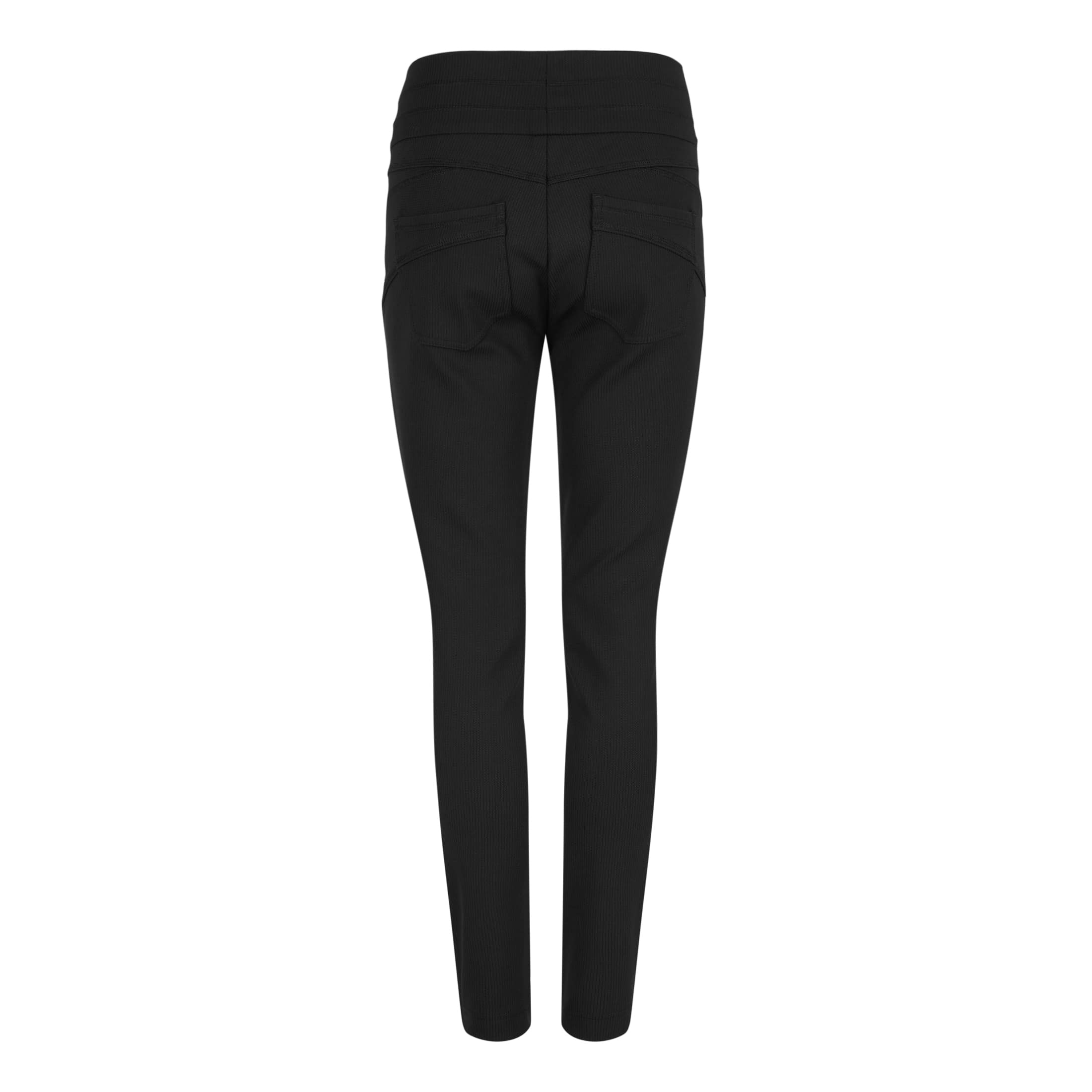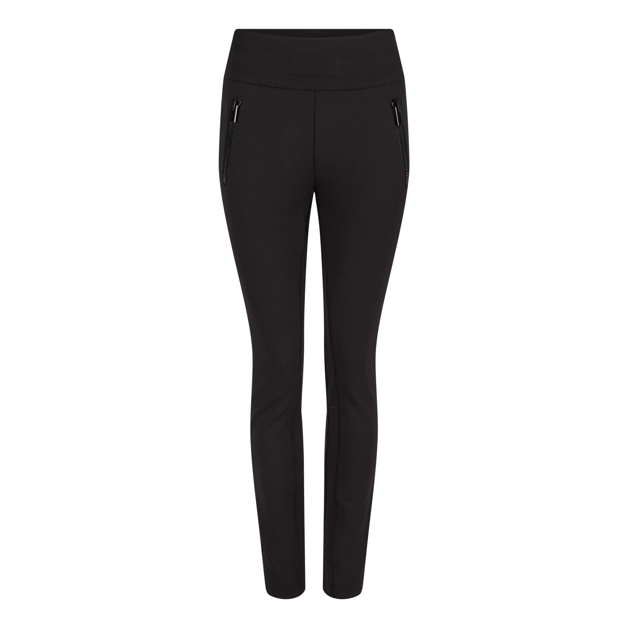Zwarte skinny broek van Marc Aurel. Deze aansluitende broek is gemaakt van een zwarte stretch stof met fijne ribbeltjes en heeft een hoge elastische taille. De broek heeft twee steekzakken achter ritsjes en twee achterzakken.