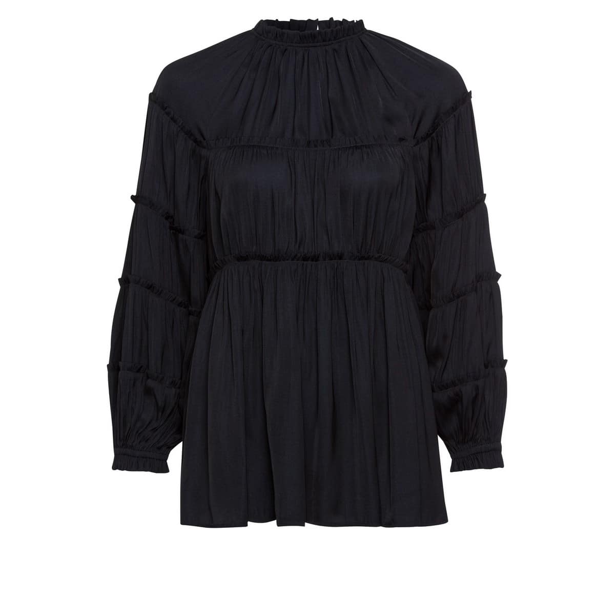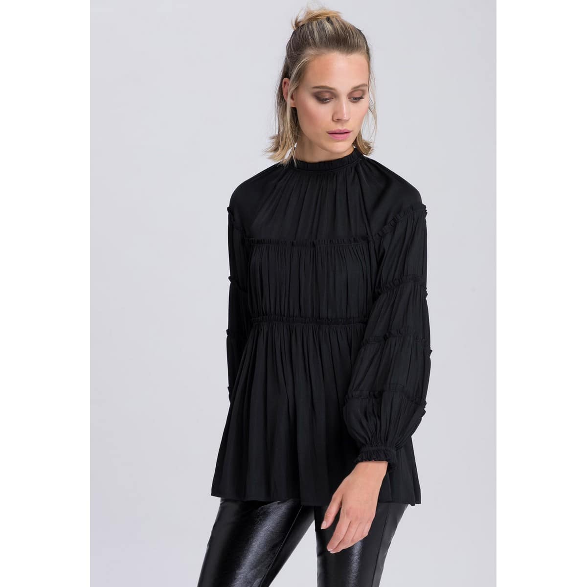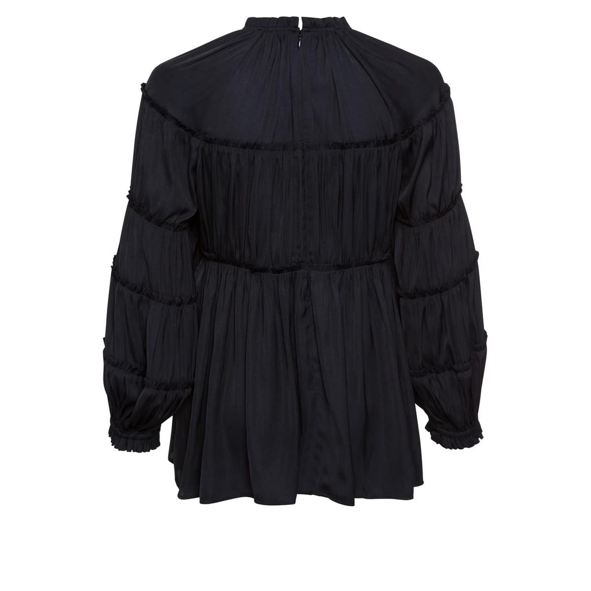 Zwart blouse van Marc Aurel. Deze losvallende blouse heeft een hoge hals, pofmouwen en ruches die over de gehele blouse terugkomen. De blouse sluit met een verborgen ritssluiting aan de achterzijde.