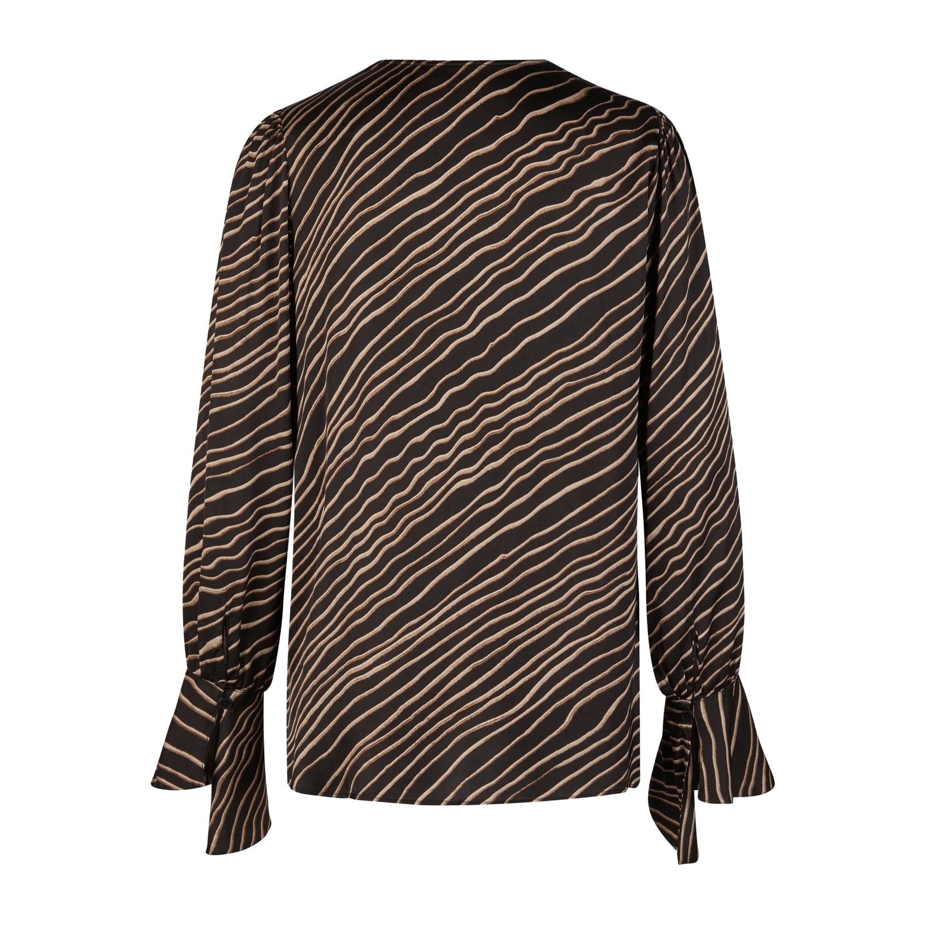Zwarte blouse met diagonale strepen van Marc Aurel. Deze losvallende blouse is gemaakt van een gladde zwarte stof met een bruin witte tekening. De blouse heeft een V-hals en lange manchetten.