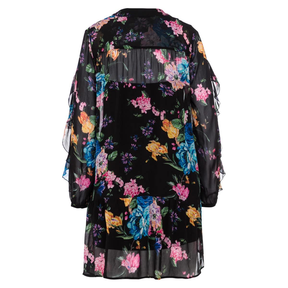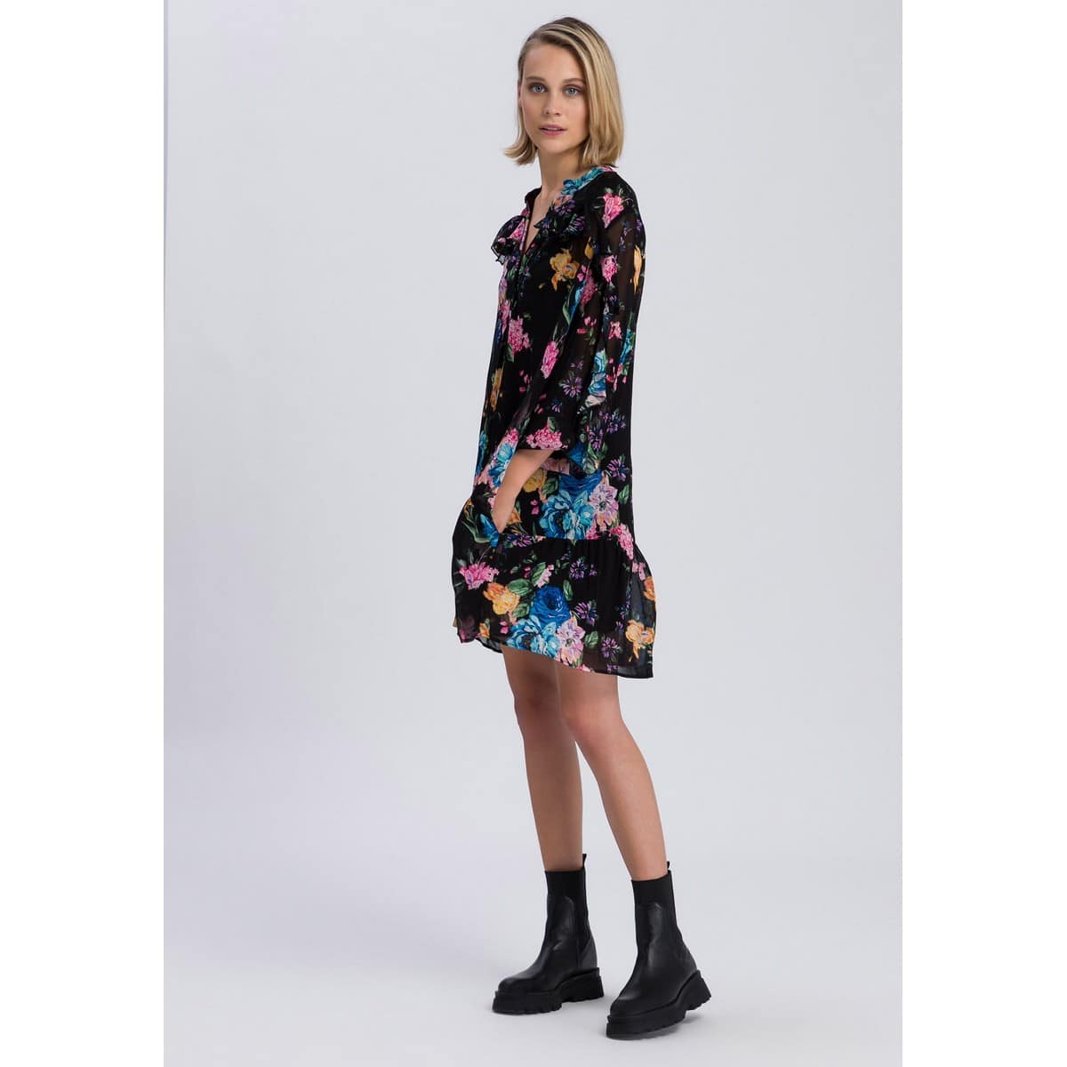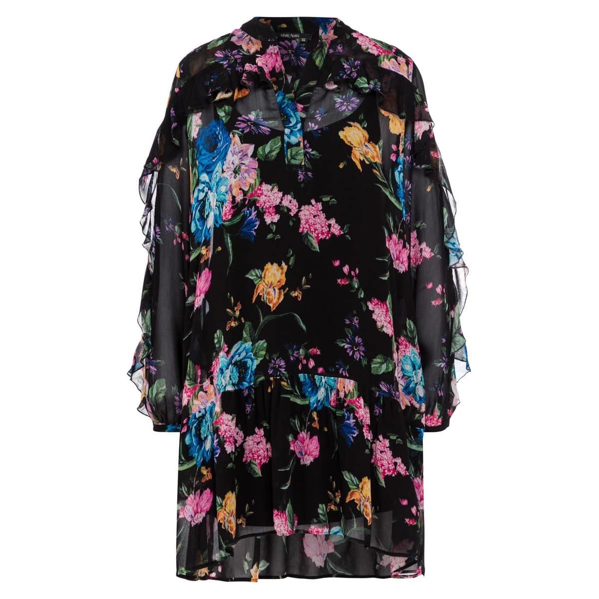 Zwart kleedje van Marc Aurel. Deze jurk valt aan de voorzijde iets hoger dan aan de achterzijde, heeft een onderjurk en een zwarte bovenlaag met kleurrijke bloemen. De jurk heeft een V-hals, doorschijnende mouwen, twee steekzakken en elegante ruches aan de mouwen en schouders.