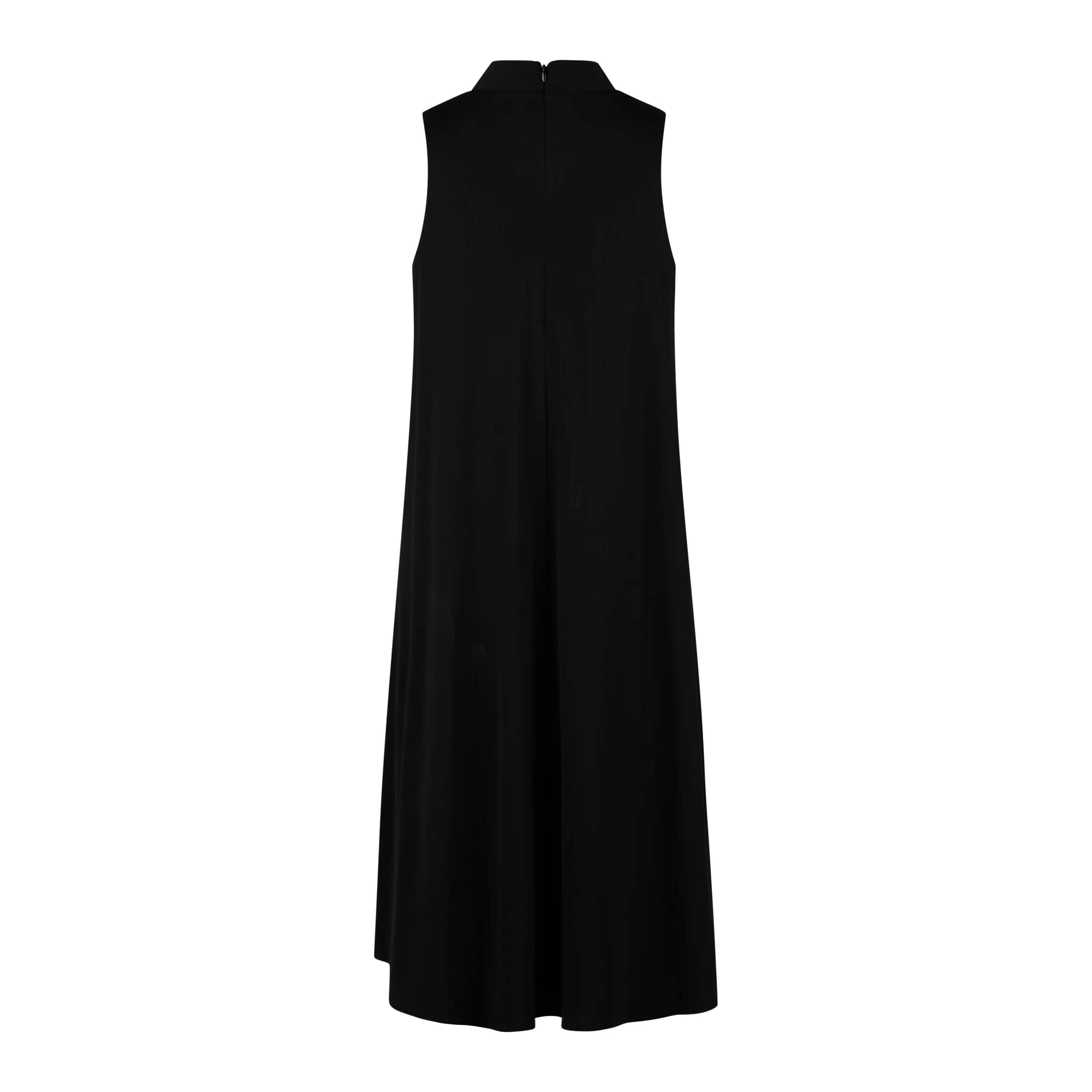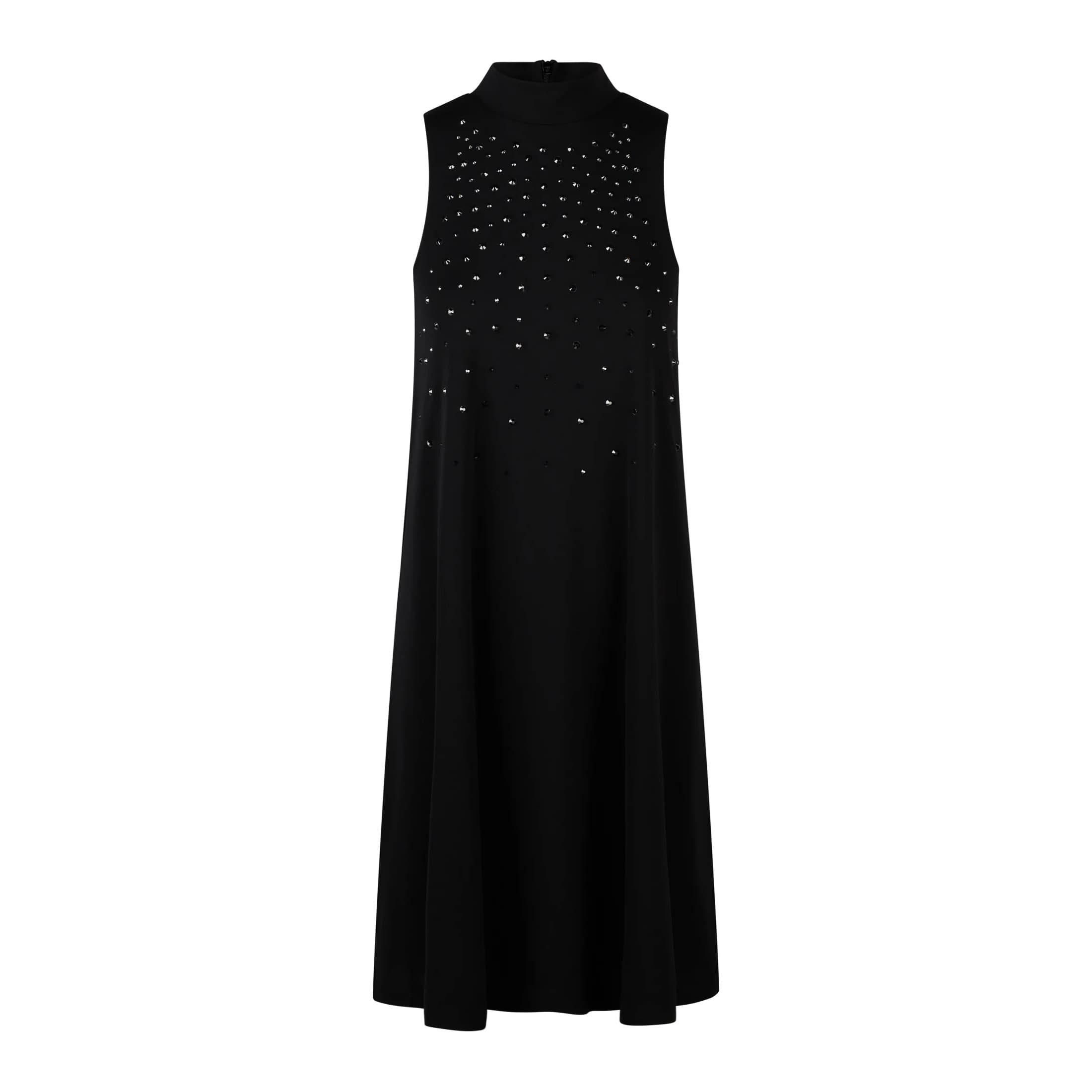 Zwart kleedje van Marc Aurel. Deze mouwloze jurk is gemaakt van een zwarte jersey stof, heeft een los vallende pasvorm en valt boven de knie. De jurk heeft een opstaande hals en aan de voorzijde strass steentjes op de body.