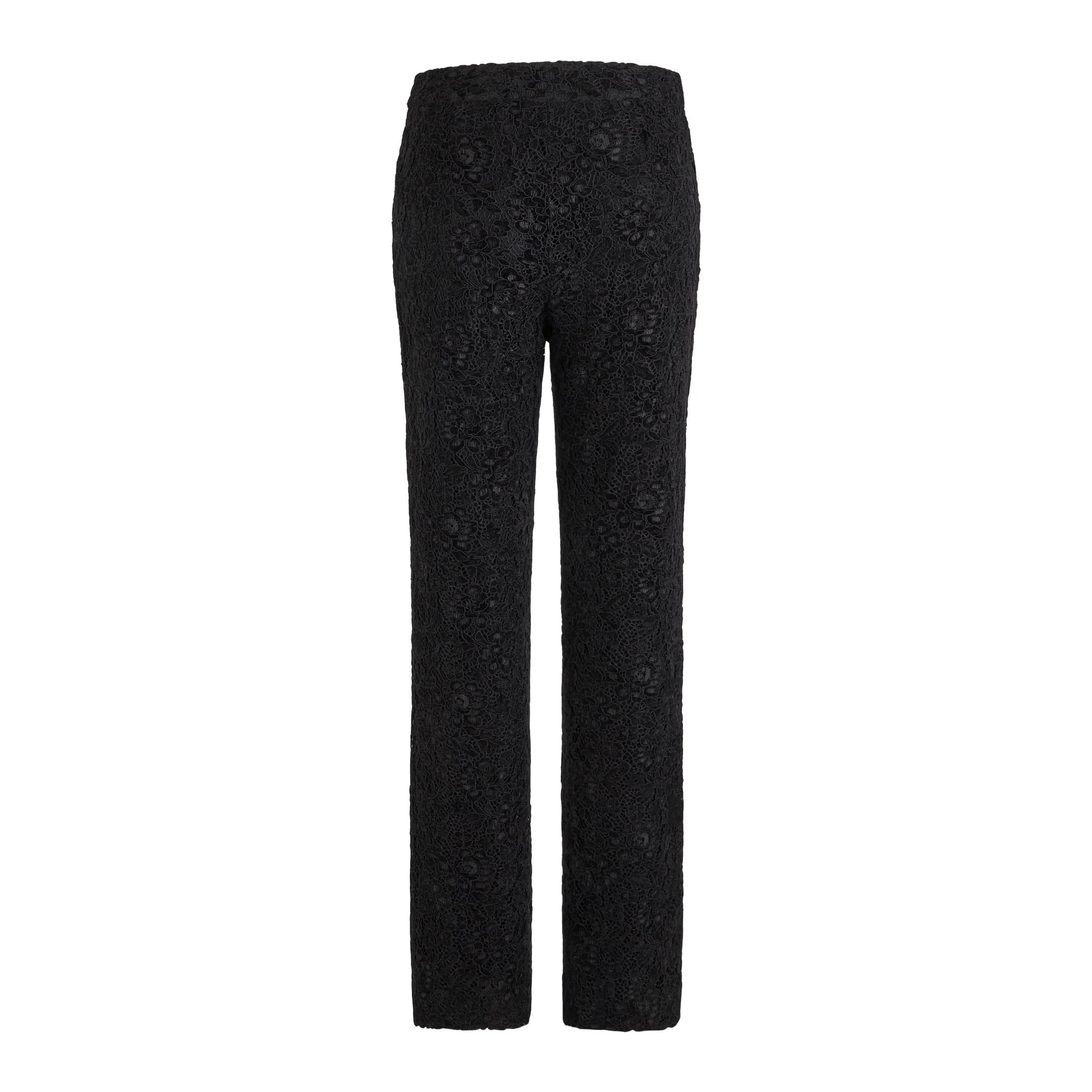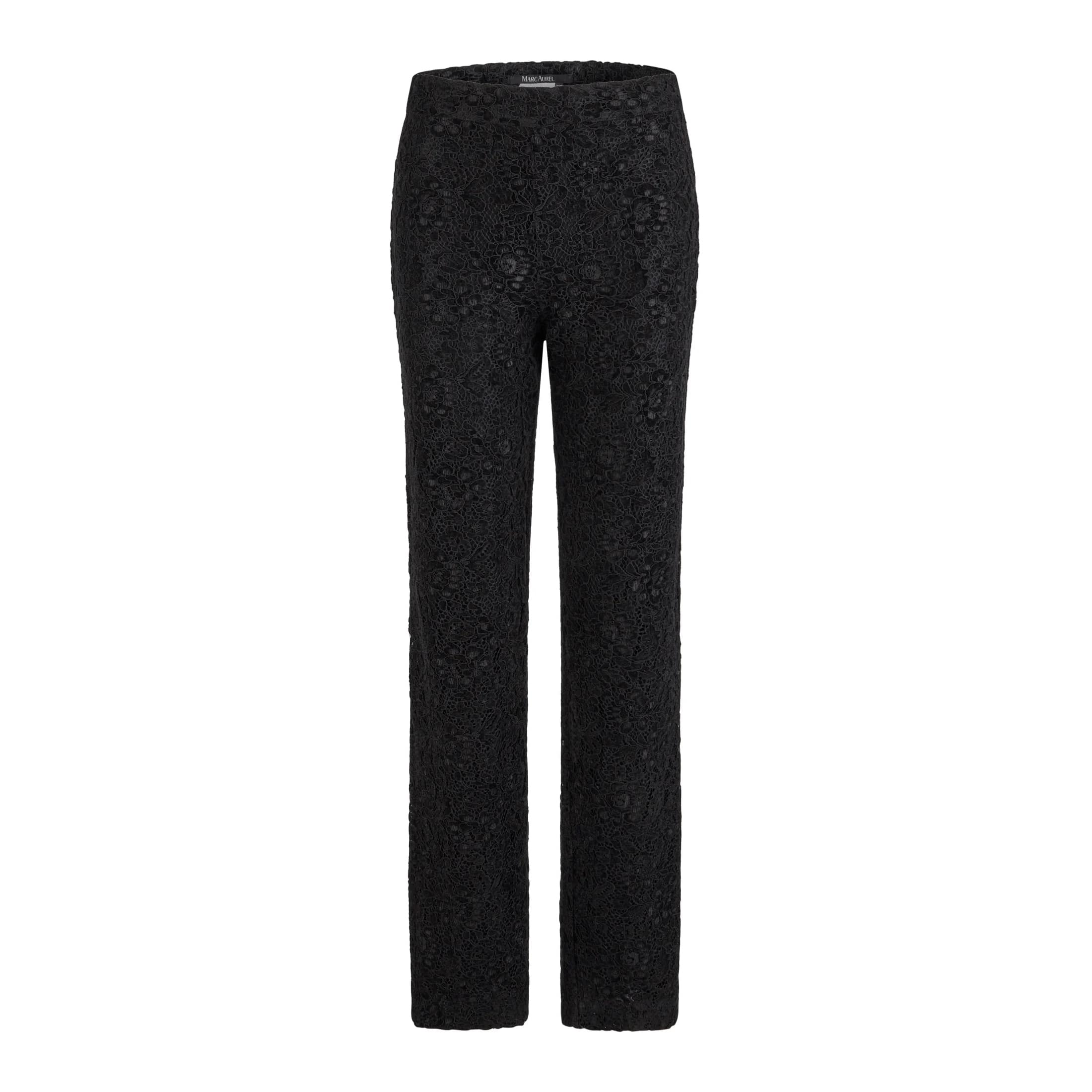 Zwarte kanten pantalon van Marc Aurel, model velvety lace pants. Deze broek is gemaakt van een zwarte fluwelen kanten stof en heeft een hoge taille. De jeans heeft een rechte pasvorm en sluit met een ritssluiting aan de zijkant.