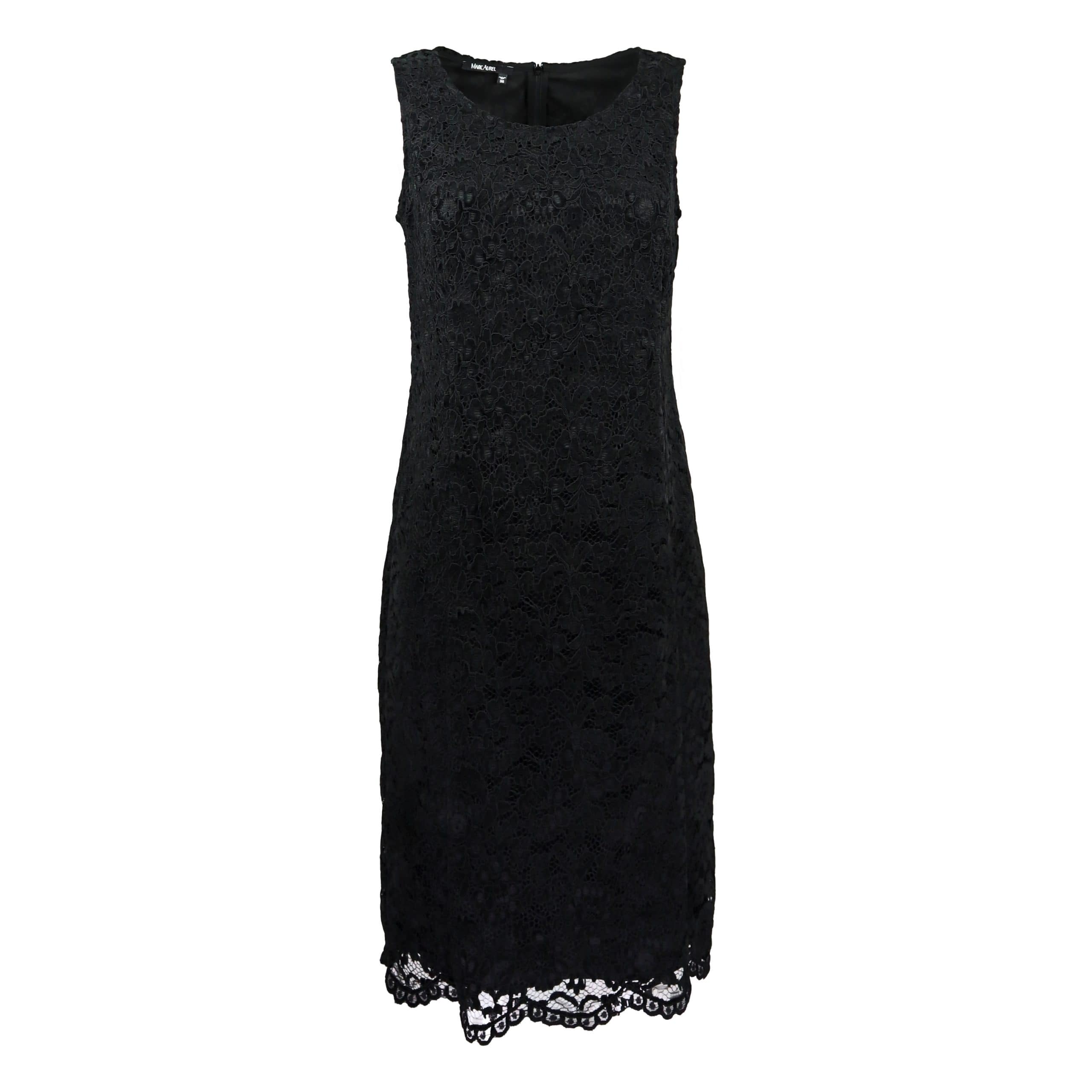Zwart kanten kleedje van Marc Aurel, model velvety lace dress. Deze jurk is gemaakt van een zwarte fluwelen kanten stof en is gevoerd. De jurk is mouwloos, heeft een passende pasvorm, sluit met een verborgen ritssluitling aan de achterzijde en valt net boven de knie.