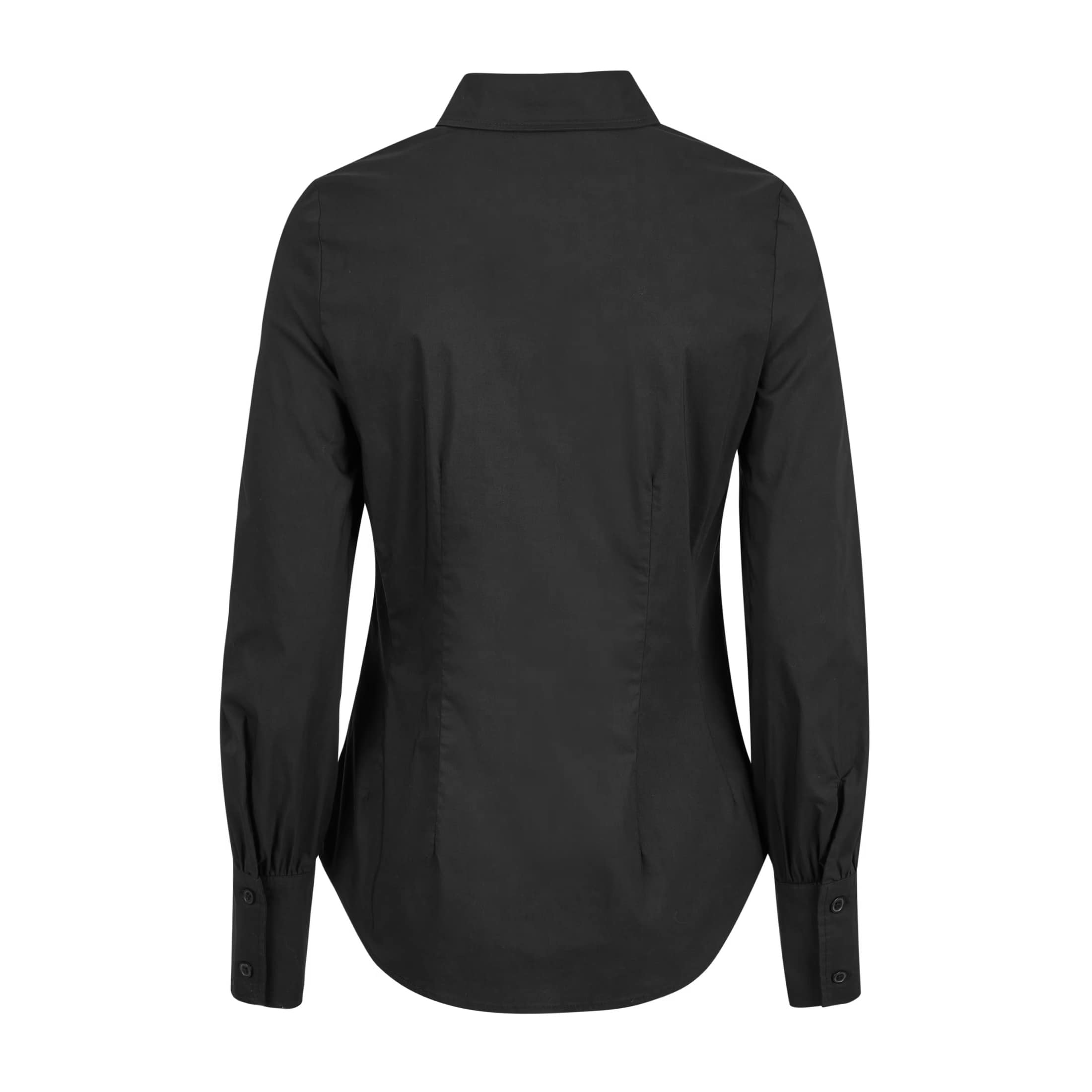 Zwarte getailleerde blouse van Marc Aurel. Deze katoenen blouse heeft een klassieke aansluitende pasvorm met kraag en lange mouwen. De blouse heeft aan de voorzijde een verborgen knoopsluiting en een geborduurde M op de borst.