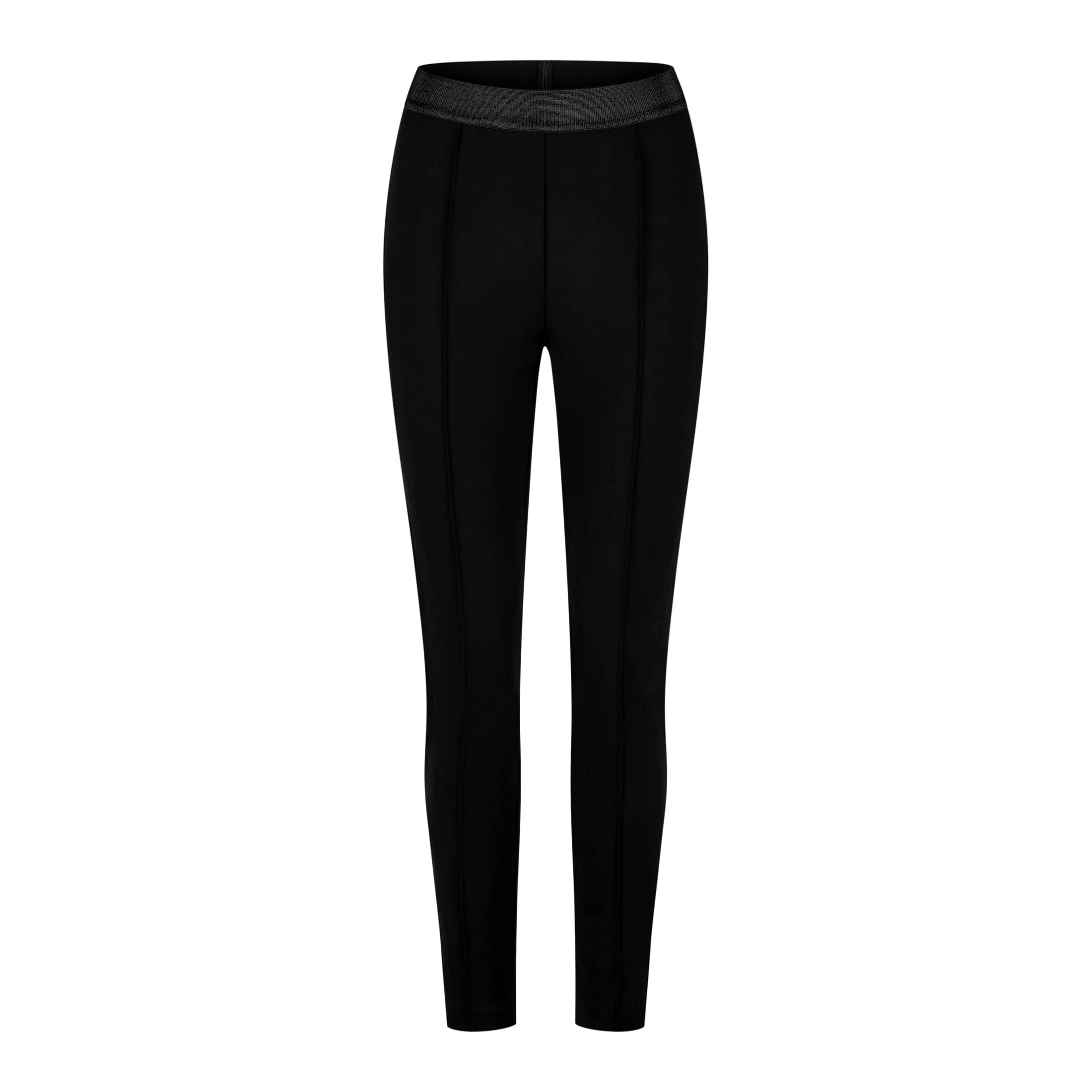 Zwarte legging van Marc Aurel, model leggings made from ready-made jersey. Deze aansluitende broek is gemaakt van een zwarte dikkere jersey stretch stof en heeft een normale taille. De broek heeft een elastische tailleband en een vast naad op de voorkant van de broekspijpen.