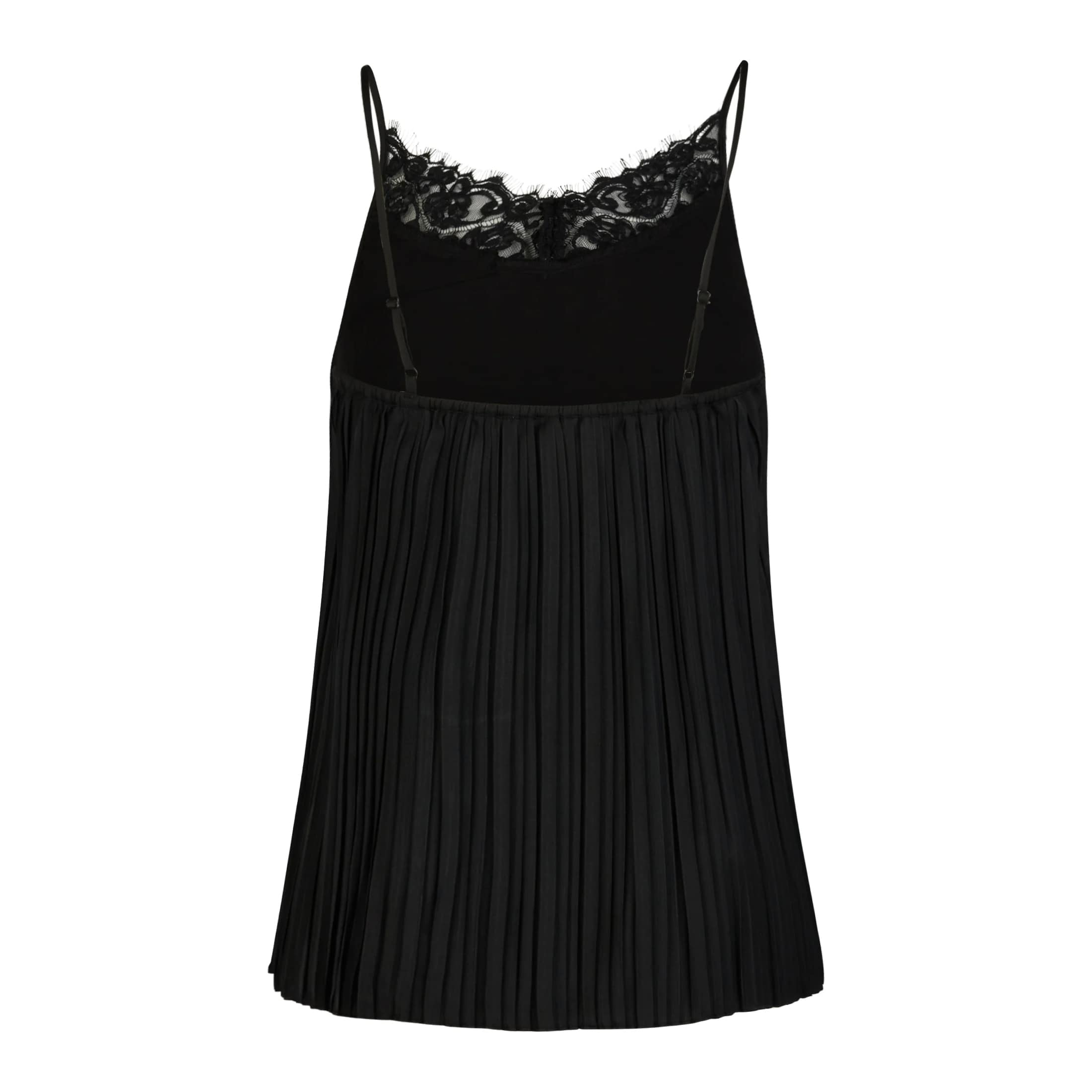 Zwarte top van Marc Aurel, model spaghetti top with lace. Deze top is gemaakt van satijn en is geplooid. Aan de hals heeft de top een strook kant. De top heeft een losse pasvorm, V-hals en is mouwloos met verstelbare spaghetti bandjes.