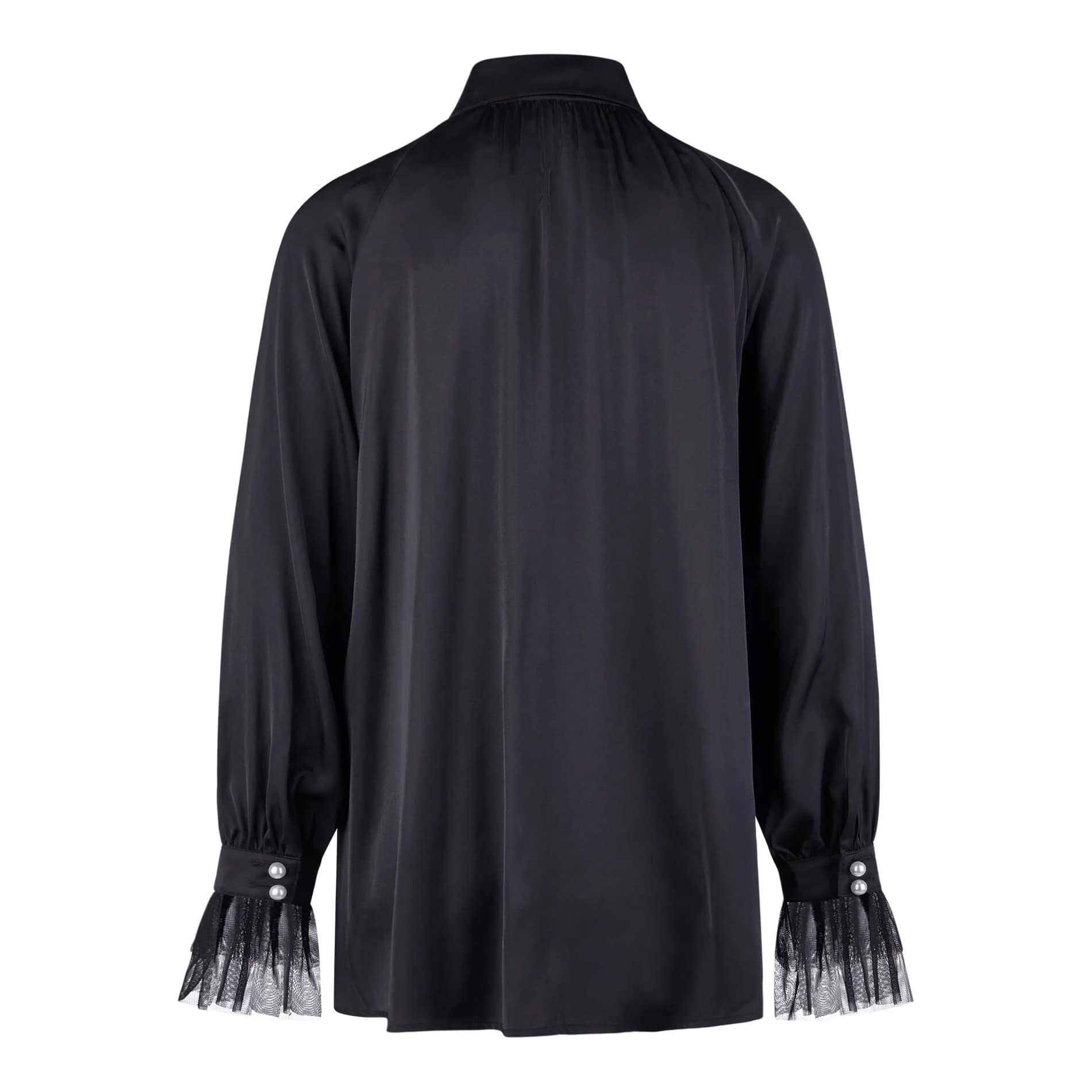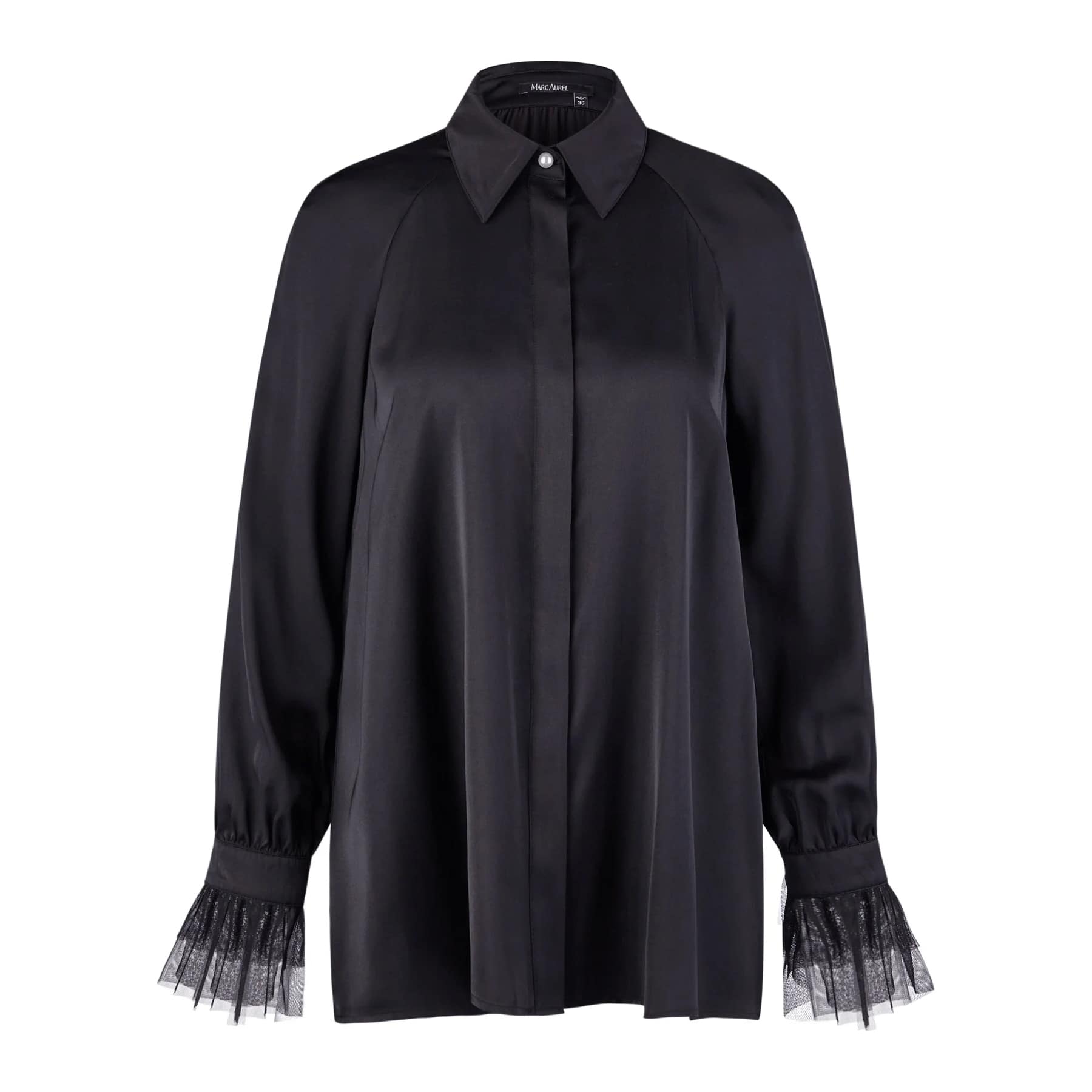 Zwarte satijnen blouse van Marc Aurel, model satin blouse with tulle cuffs. Deze satijnen blouse heeft een losse pasvorm en lange mouwen met tule manchetten. De blouse heeft aan de voorzijde een verborgen knoopsluiting en bovenaan een parel knoop.