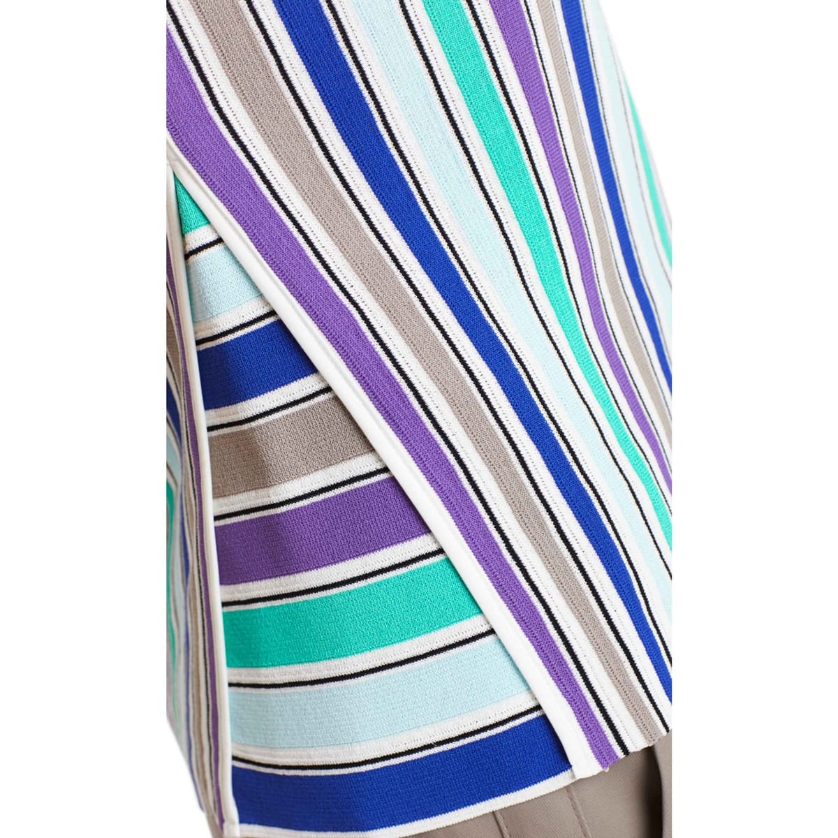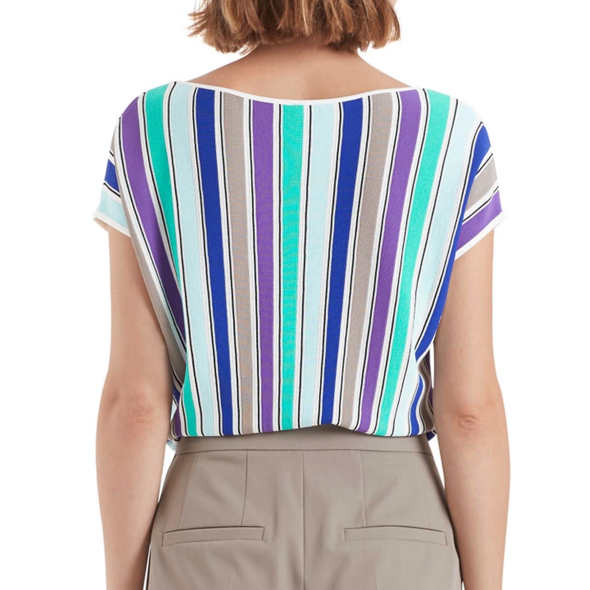 Gestreepte top van Marc Cain. Deze top is gemaakt van fijn gebreide stof en heeft een print van verticale strepen met de kleuren paars, turquoise, taupe, kobaltblauw en wit. De ronde hals heeft een witte mat satijnen bies. Aan de onderzijde loopt de top wijder uit. Hiervoor is er een stuk stof ingezet in horizontale strepen die afgewerkt is met een witte mat satijnen bies.