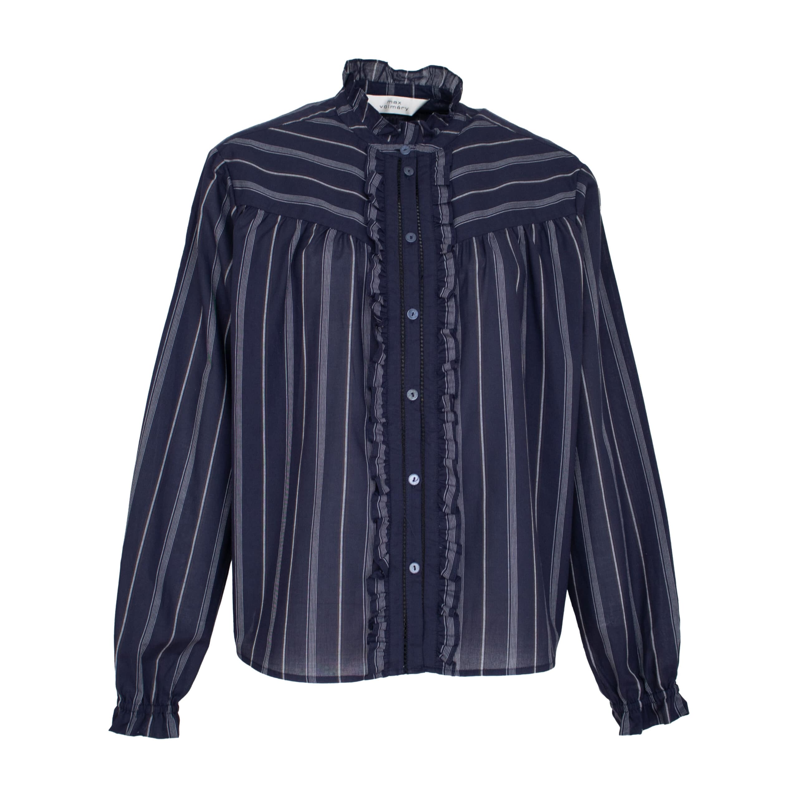 Donkerblauwe gestreepte blouse van Max Volmáry in nightblue. Deze blouse is gemaakt van katoen en heeft elegante ruches langs de knoopsluiting, in de hals en aan de manchetten. De blouse is fijn gestreept, valt onder schouders geplooid en heeft een losse pasvorm.