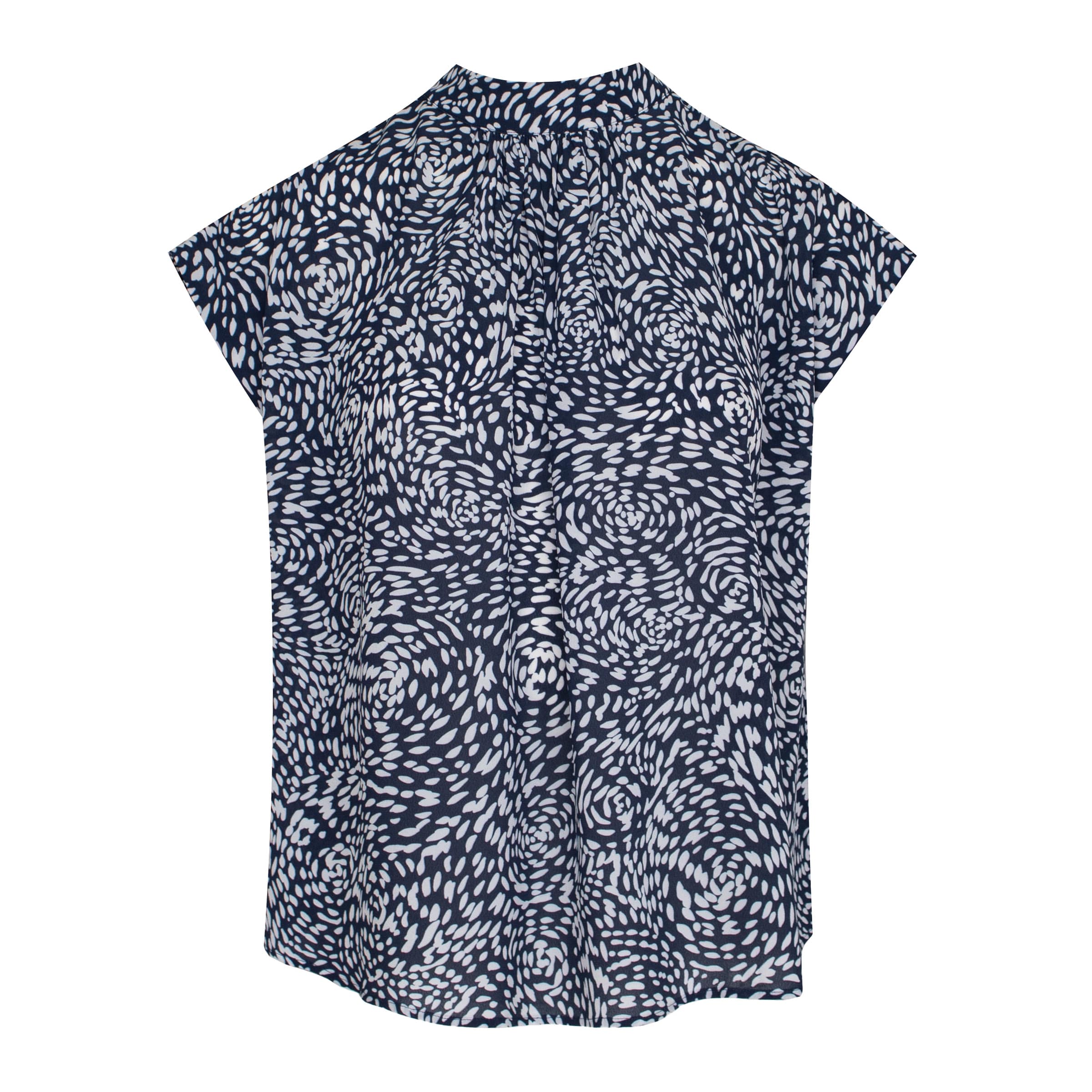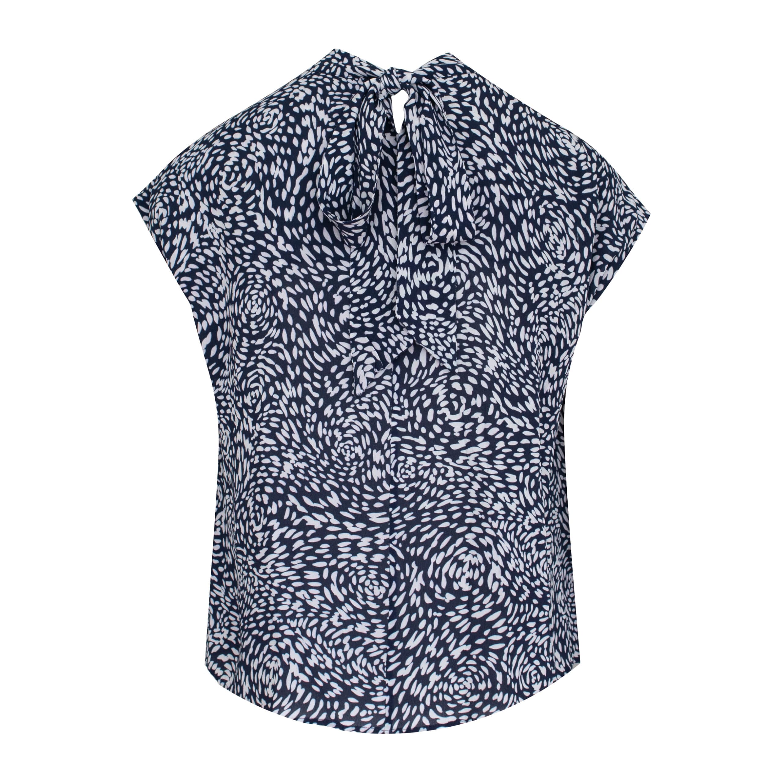 Donkerblauwe top van Max Volmáry in nightblue. Deze top is gemaakt van viscose, heeft een donkerblauw met wit motief, korte mouwen en een los vallende pasvorm. De top heeft een geplooide hals en sluit aan de achterzijde met linten die in een strik gelegd kunnen worden.