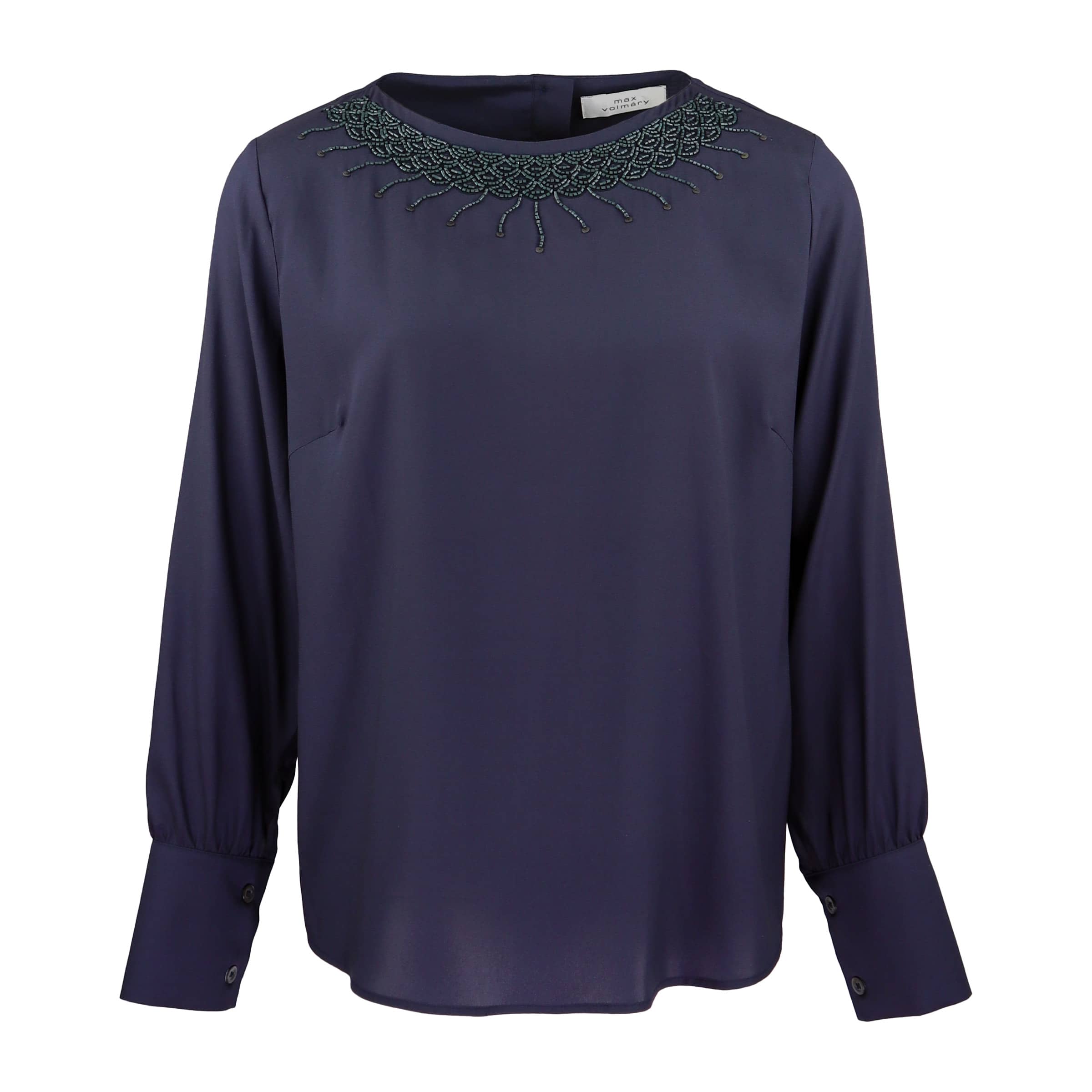 Donkerblauwe zijden blouse van Max Volmáry. Deze blouse is gemaakt van zijde met een beetje stretch en heeft elegante kraaltjes aan de hals. De blouse sluit met een korte knoopsluiting aan de achterzijde, heeft lange mouwen en een losvallende pasvorm.