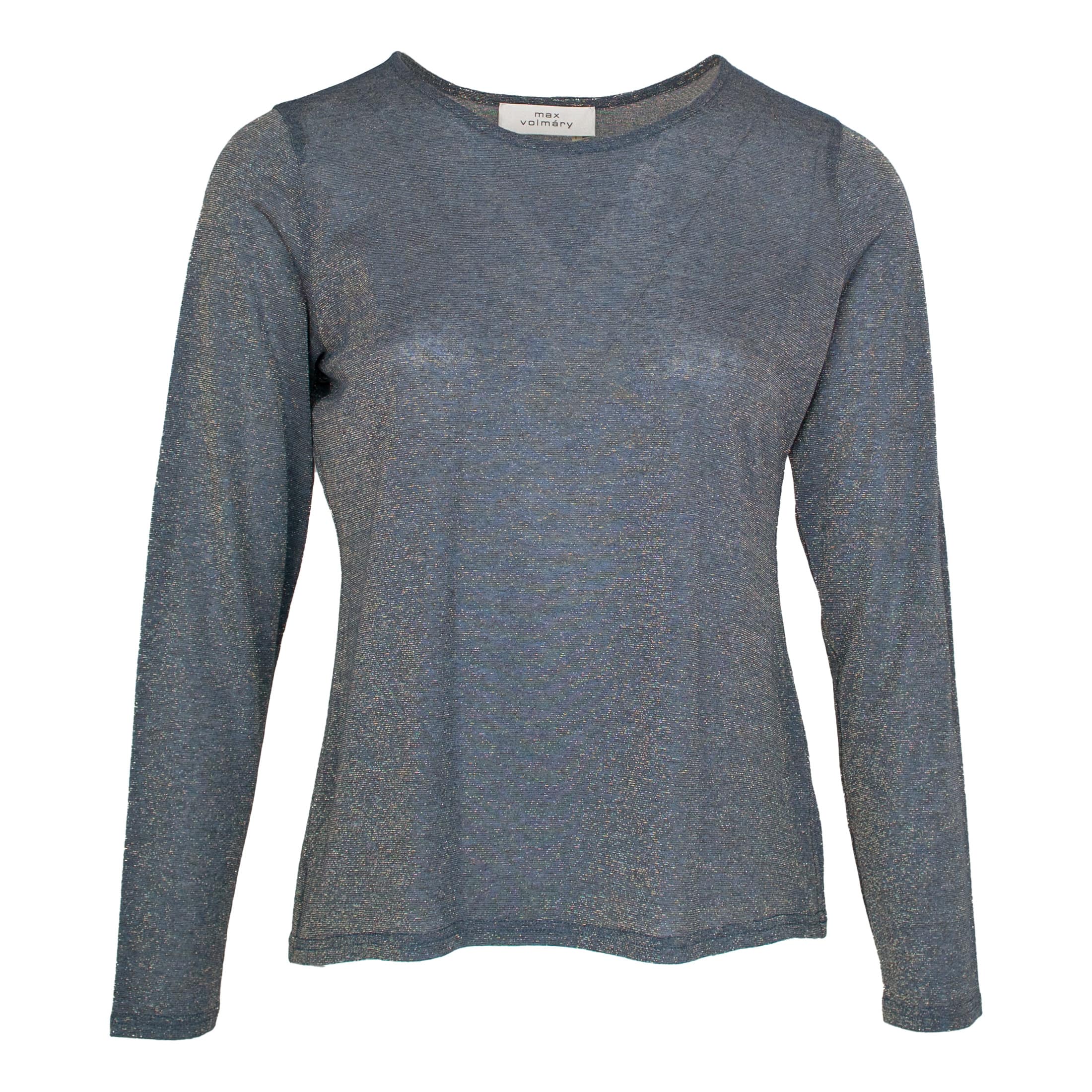Top van Max Volmáry in nightblue. Deze dunne top is gemaakt van een blauwe stof waar een gouddraad doorheen verweven is. De top heeft een losse pasvorm, ronde hals en lange mouwen.