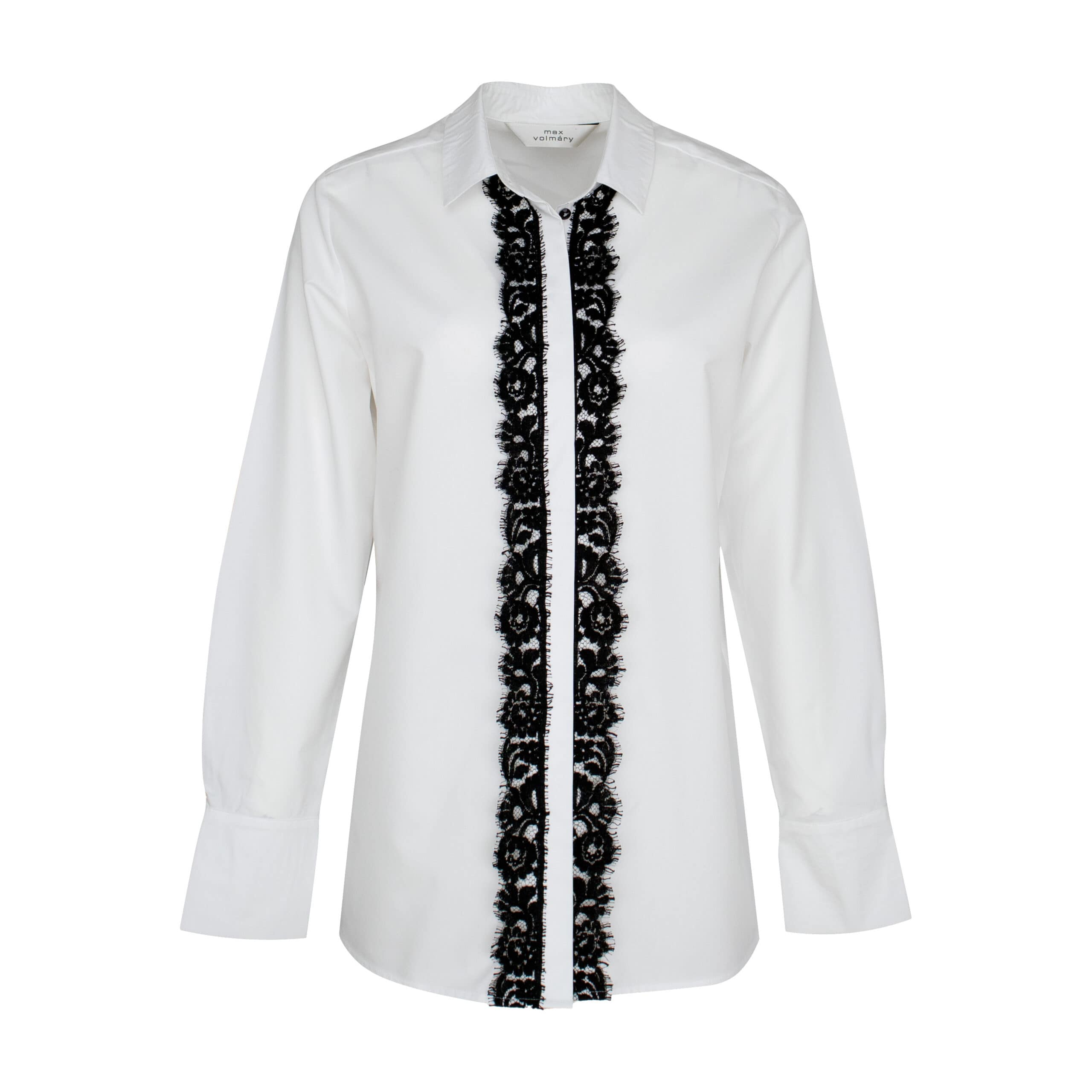 Witte blouse van Max Volmáry. Deze blouse is gemaakt van een katoen met lyocell mix en heeft bij de verborgen knoopsluiting een strook zwarte kant. De blouse heeft lange mouwen, manchetten, klassieke kraag en een rechte pasvorm.