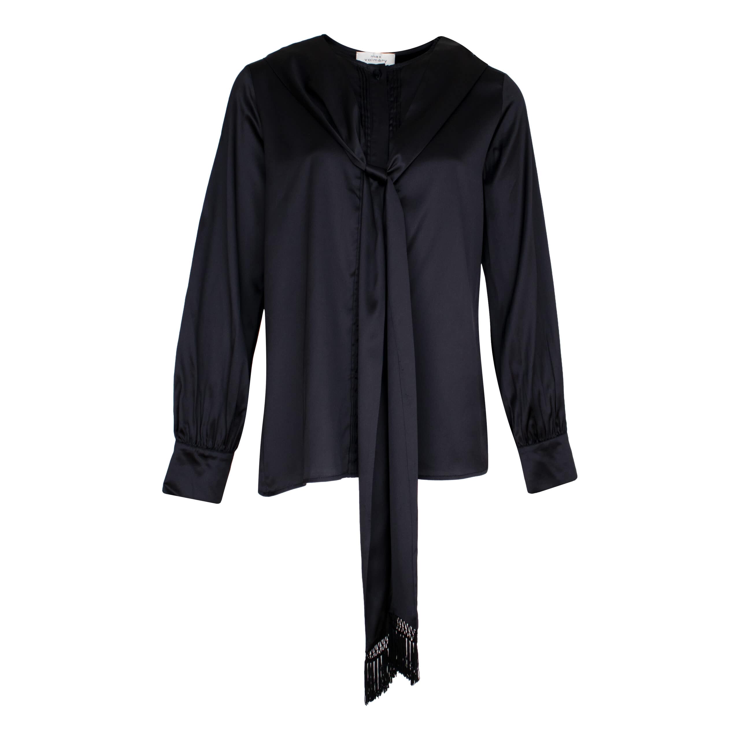 Zwarte satijnen blouse van Max Volmáry. Deze blouse is gemaakt van een zwarte satijnen stretch stof en heeft een lang, bijpassend lint met franjes aan de onderzijde. Dit lint kan los gedragen worden of vastgezet met een knoopje in de hals. De blouse sluit met een verborgen knoopsluiting, heeft geplooide manchetten en een normale pasvorm.