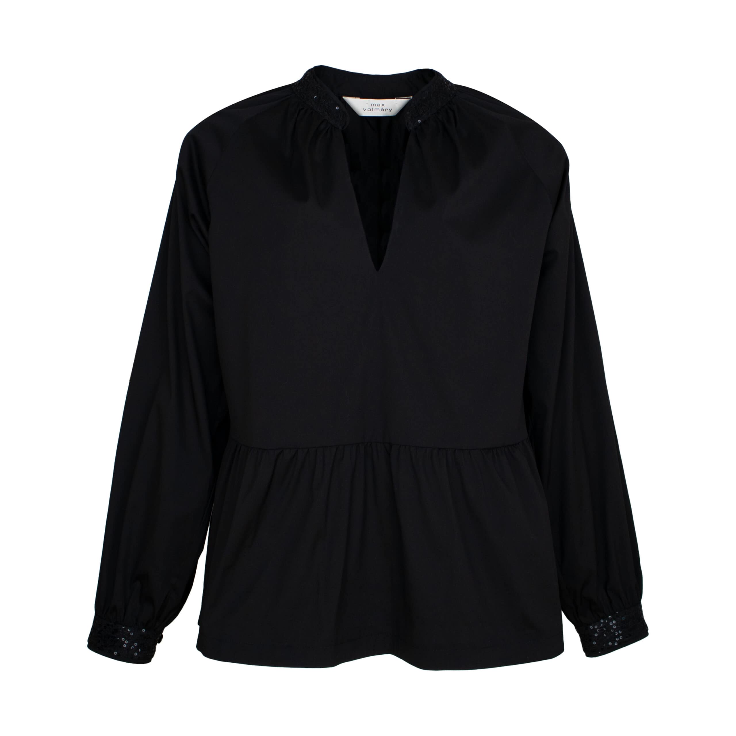 Zwarte tuniek van Max Volmáry. Deze tuniek is gemaakt van een zwarte katoenen stretch stof en heeft een los vallende pasvorm. De tuniek heeft een V-insnede, ruches en heeft manchetten en een kraag die bezet zijn met zwarte pailletten.