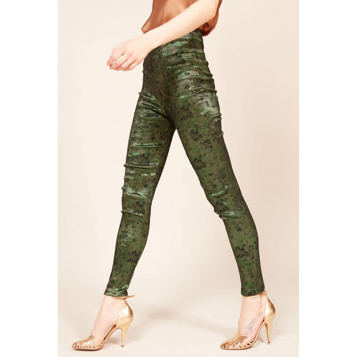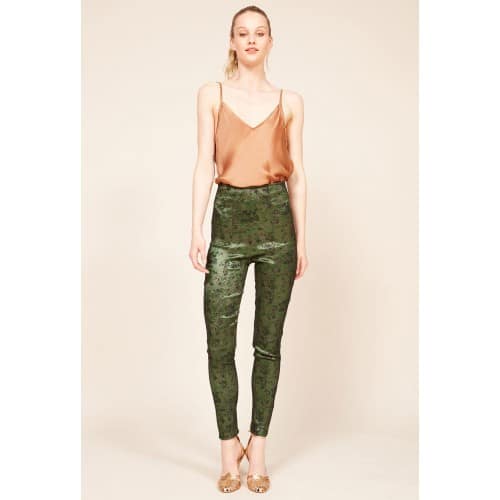 Donkergroene legging van Mes Demoiselles, model Veronika. Deze strakke pantalon heeft een hoge taille, is gemaakt van een stevige stretch stof en sluit met een verborgen ritssluiting aan de zijkant. De broek heeft een donkergroene basis met zwarte en gouden bloemen en een satijnen afwerking.