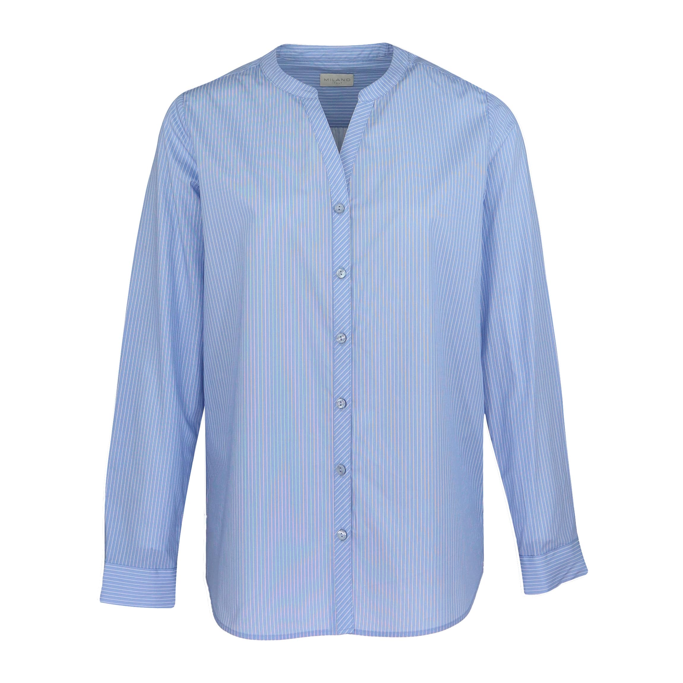 Blauwe, gestreepte blouse van Milano Italy. Deze blouse is gemaakt van katoen en heeft een blauwe basis met een dunne verticale witte streep. De blouse sluit met een knoopsluiting aan de voorzijde, heeft een ronde hals met insnede en losse pasvorm.