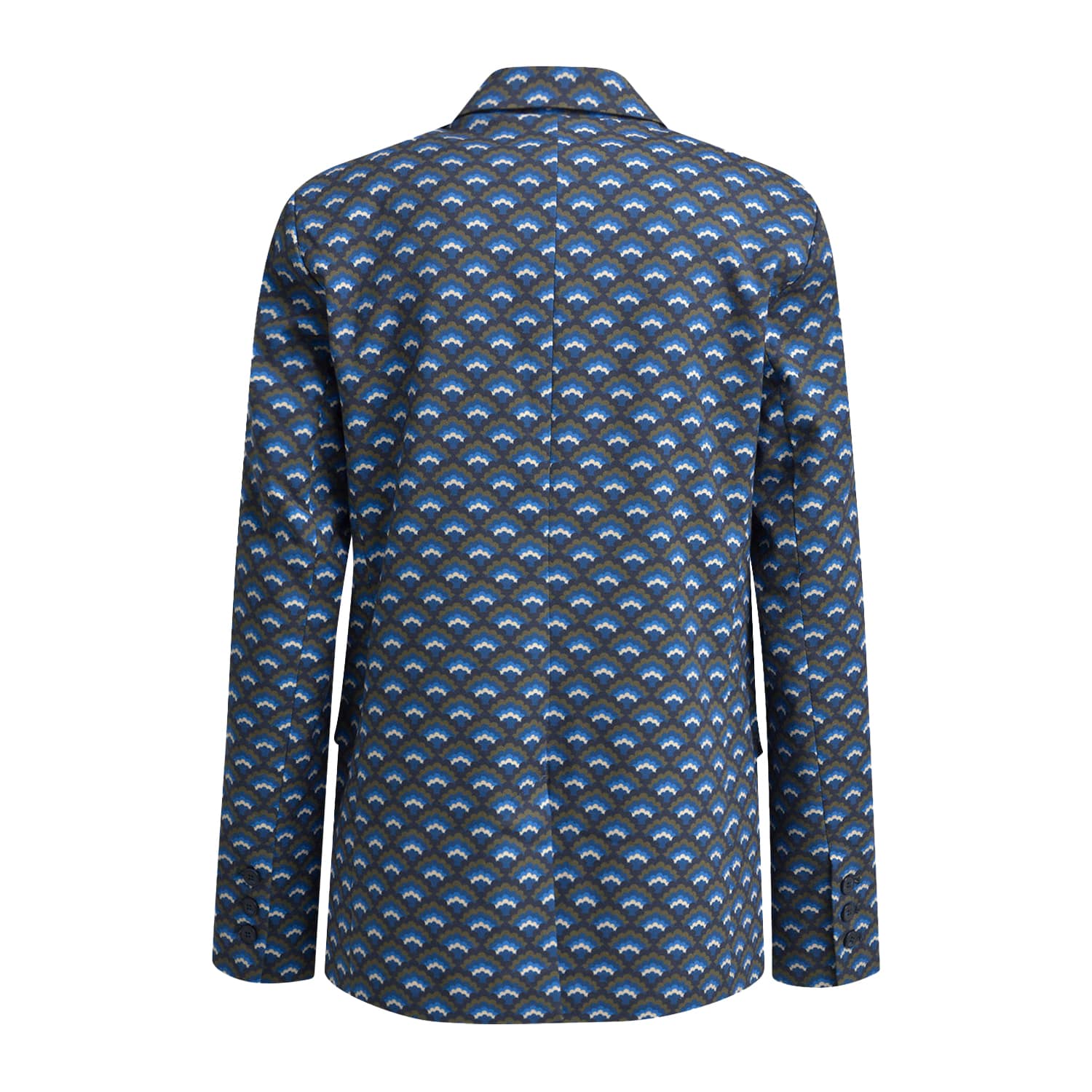 Blauwe blazer van Milano Italy in navy print. Deze gevoerde blazer heeft een donkerblauwe print met “wolkjes”, kleine schoudervullingen, splitje aan de achterzijde en een normale pasvorm. De blazer sluit met een knoopsluiting aan de voorzijde, heeft een klassieke kraag en twee klepzakjes.