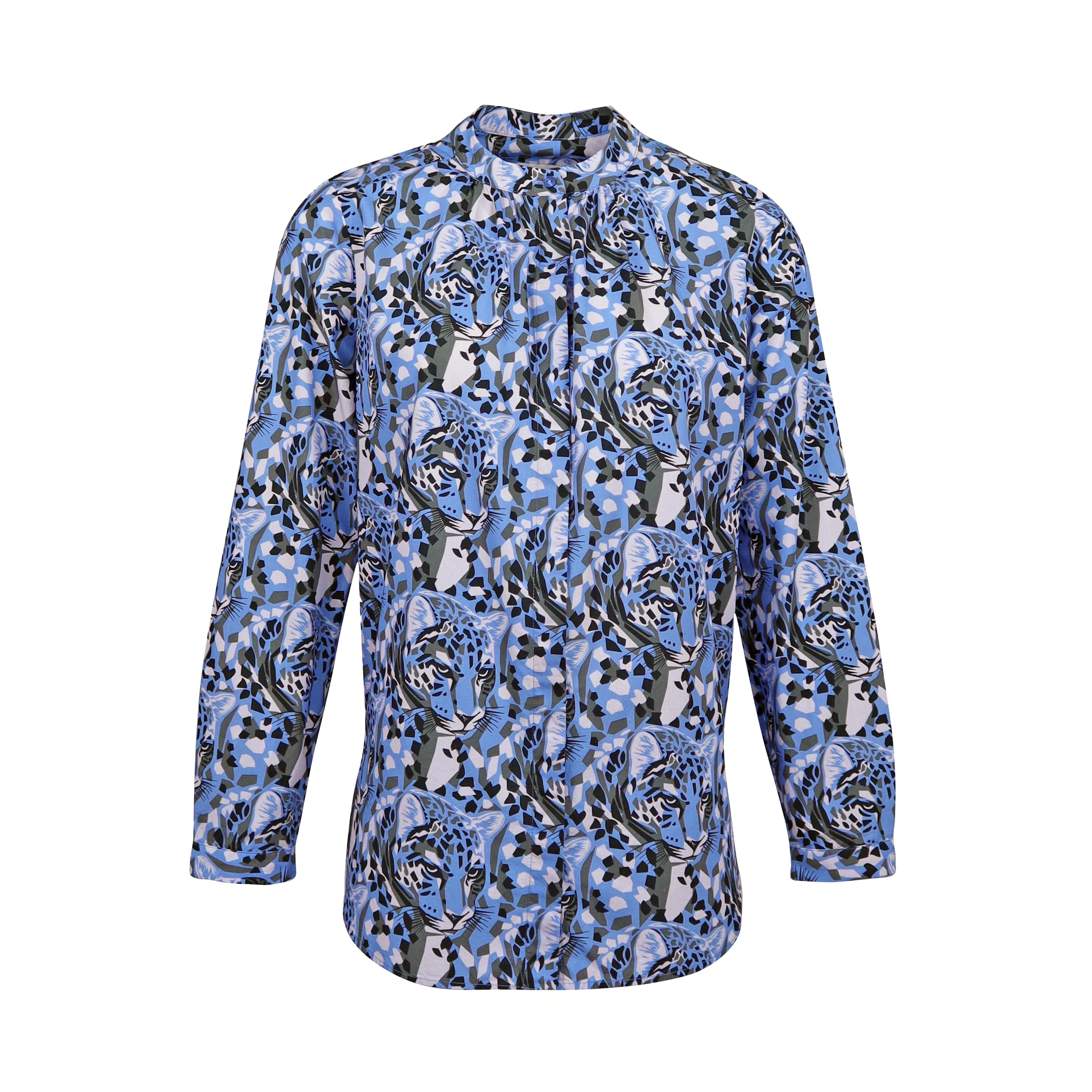 Losvallende blouse van Milano Italy. Deze blauwe blouse is gemaakt van katoen en heeft een ijsblauw, grijze print met luipaarden. De blouse sluit aan de voorzijde met kleine knoopjes, heeft een ronde hals met plooitjes en lange mouwen.