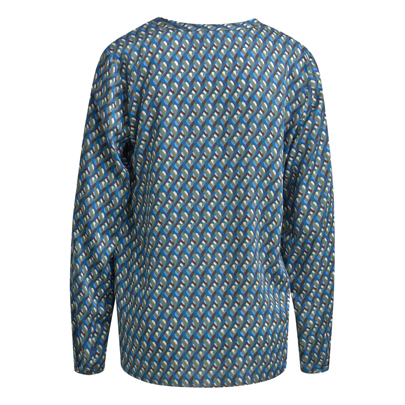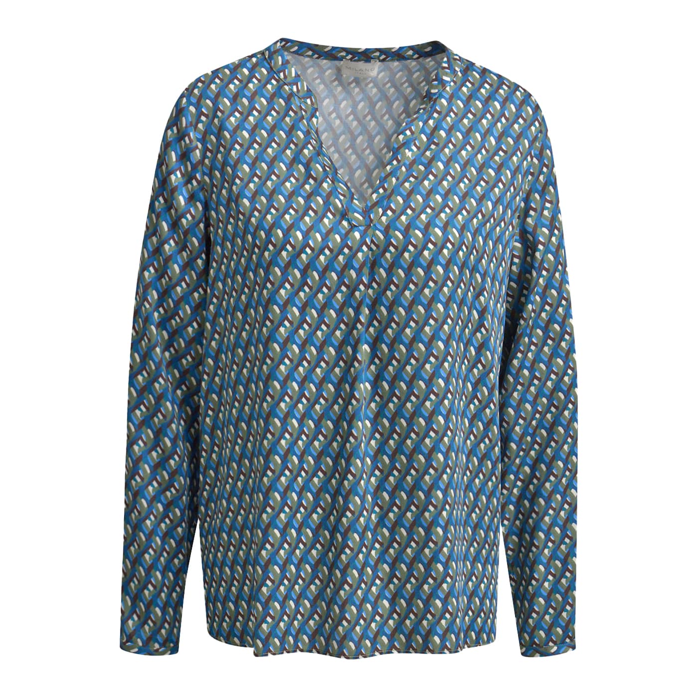 Losvallende blouse van Milano Italy in oliv print. Deze blauwe blouse is gemaakt van een soepelvallende dunne viscose stof en heeft een blauw, groen, bruin met ecru motief. De blouse heeft een relaxte ruime pasvorm, V-insnede en lange mouwen.