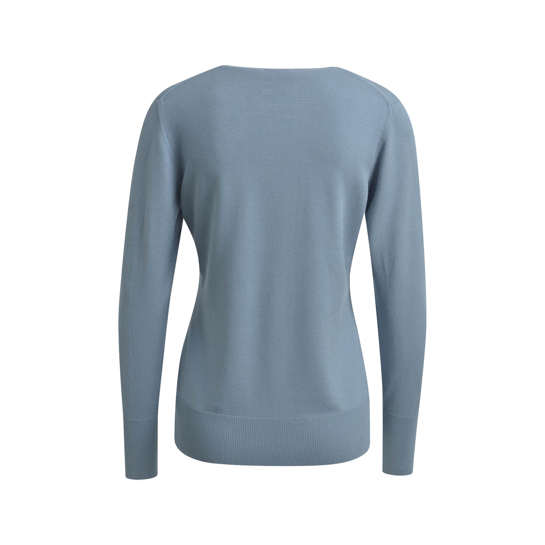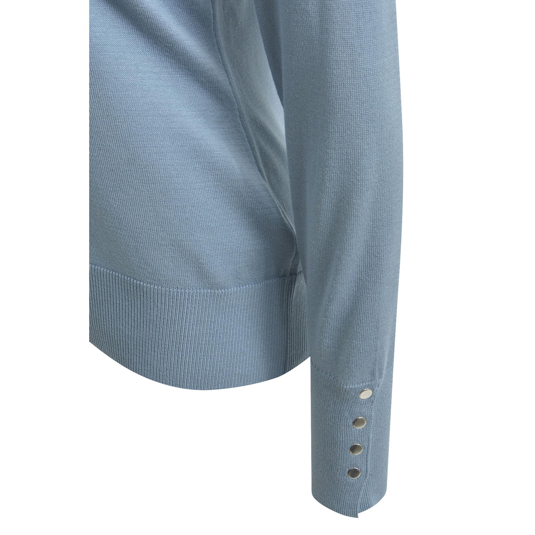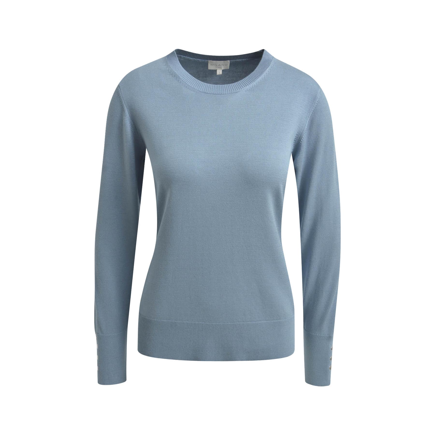 Blauwe pull van Milano Italy in iceblue. Deze fijn gebreide trui is gemaakt van viscose en heeft een normale pasvorm. De trui heeft lange mouwen met langere manchetten met kleine ronde knopjes en een ronde hals.