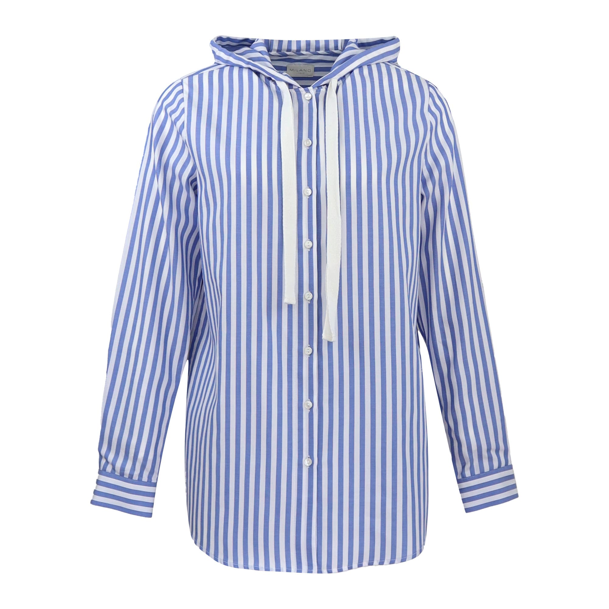 Blauw wit gestreepte blouse hoodie van Milano Italy. Deze blouse is gemaakt van katoen en heeft een capuchon met trekkoord. De blouse is los vallend, heeft lange mouwen en sluit met een knoopssluiting aan de voorzijde.