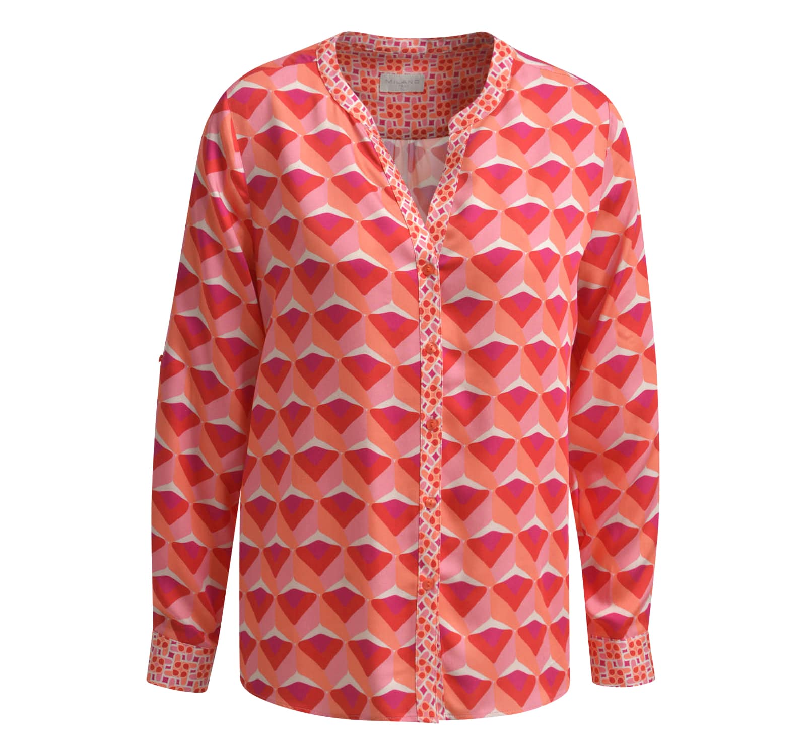 Blouse van Milano Italy in candy print. Deze blouse is gemaakt van een viscose stof met een roze, ecru, rood motief. De blouse heeft lange mouwen, los vallende pasvorm, V-hals en sluit met een knoopsluiting waarvan de stof een net andere print heeft als de rest van de blouse.