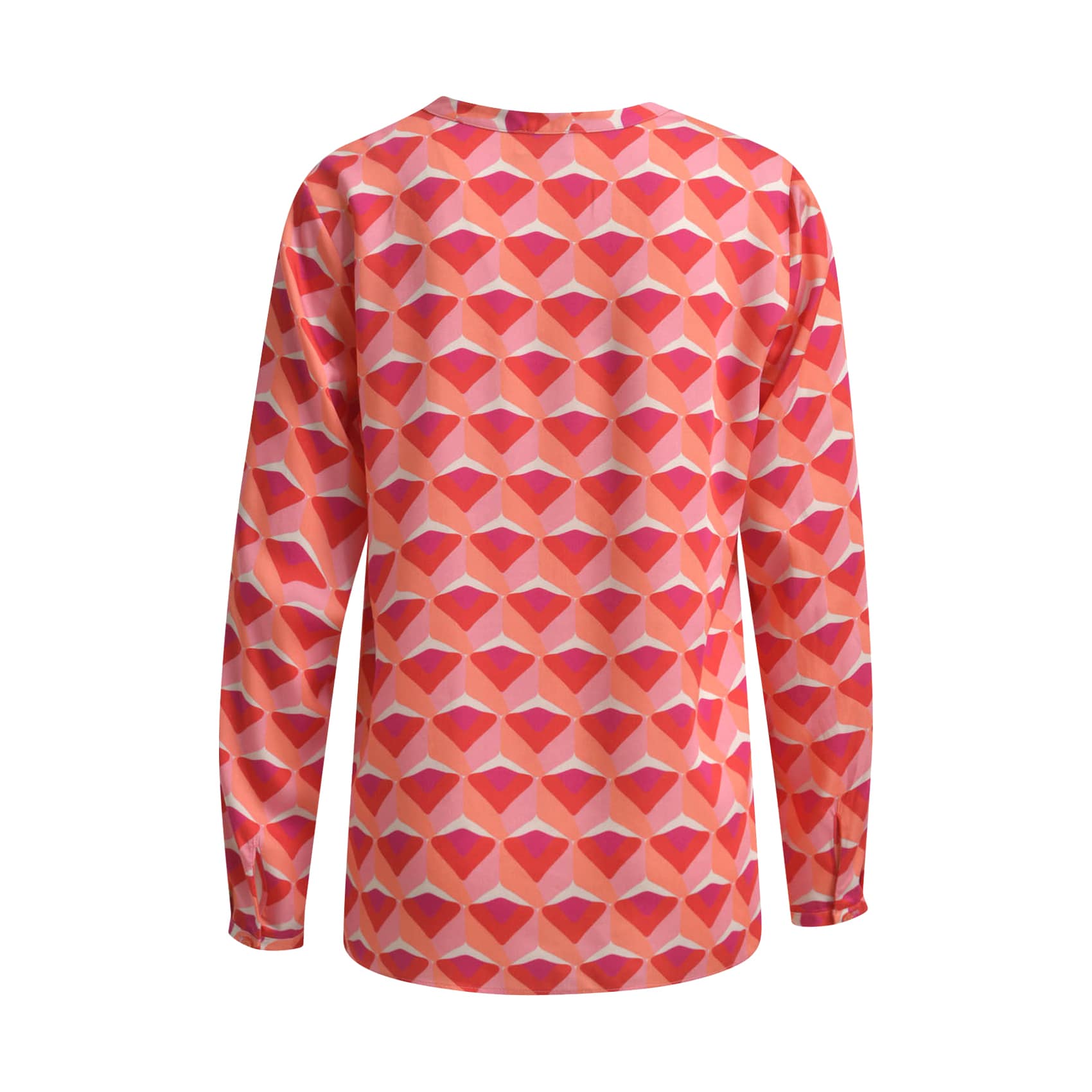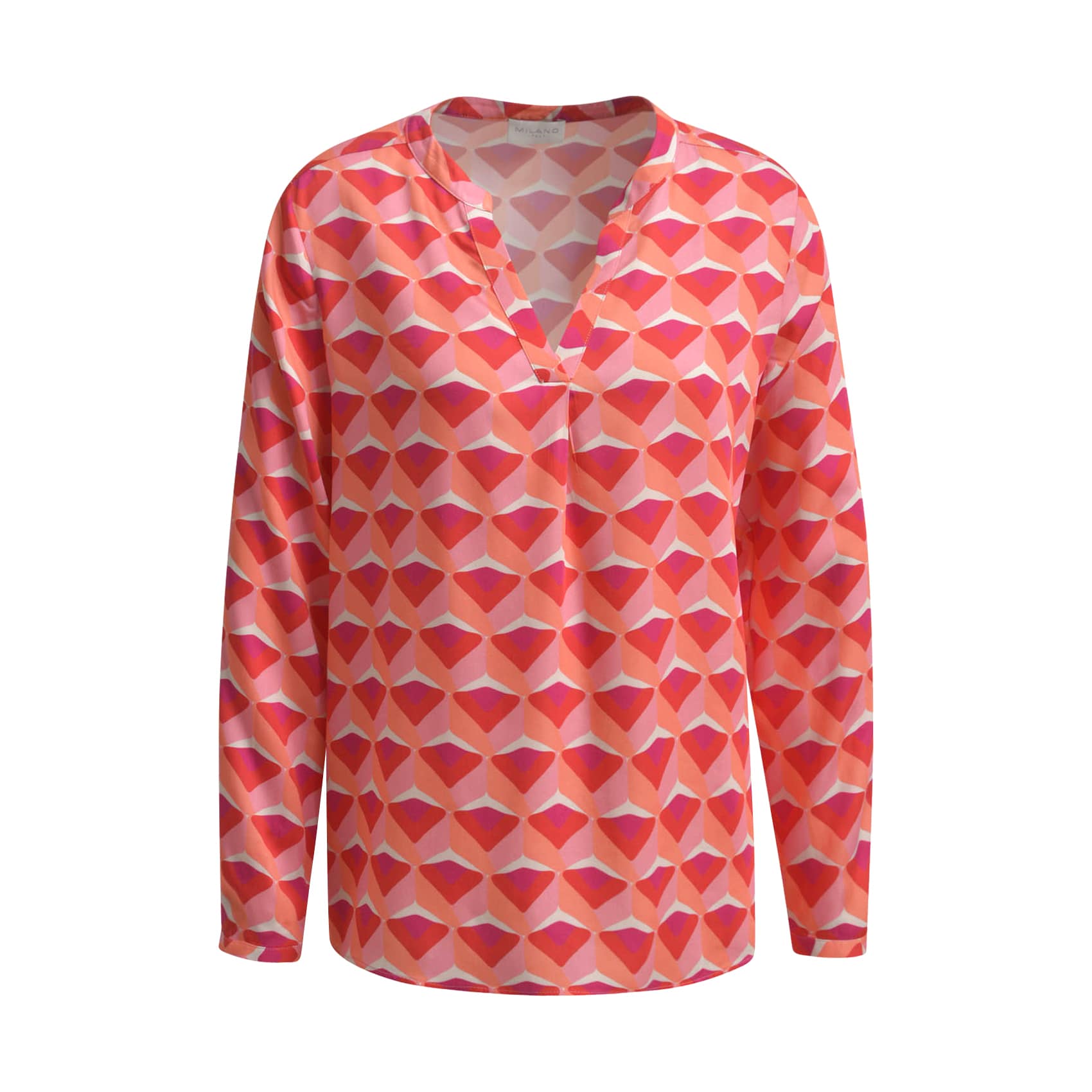 Tuniek van Milano Italy. Deze blouse is gemaakt van een viscose stof met een roze, ecru, rood motief. De tuniek heeft lange mouwen, los vallende pasvorm en een V-hals met een plooi.