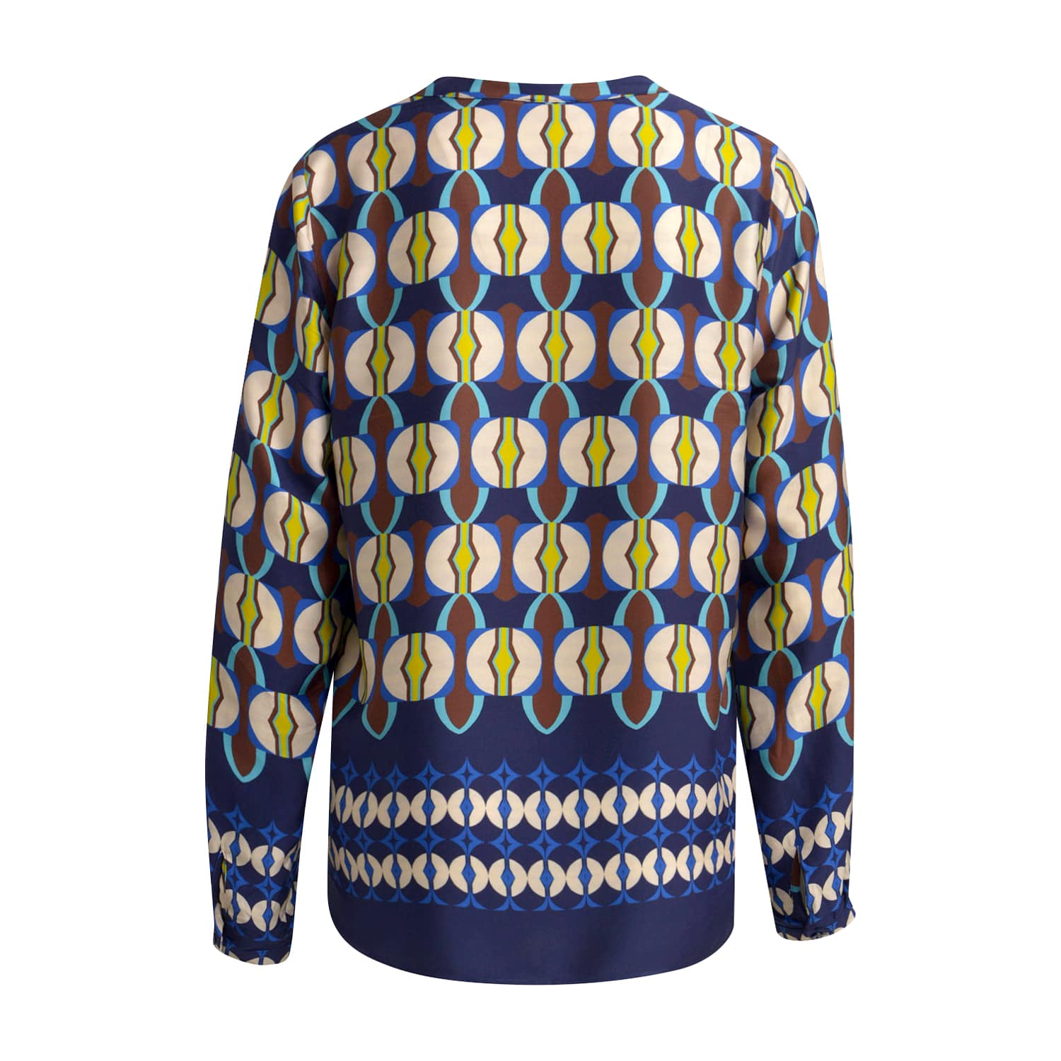 Losvallende blouse van Milano Italy. Deze donkerblauwe blouse is gemaakt van een satijnen stof en heeft een geo motief met blauw, bruin en beige. De blouse heeft een V-insnede en lange mouwen.