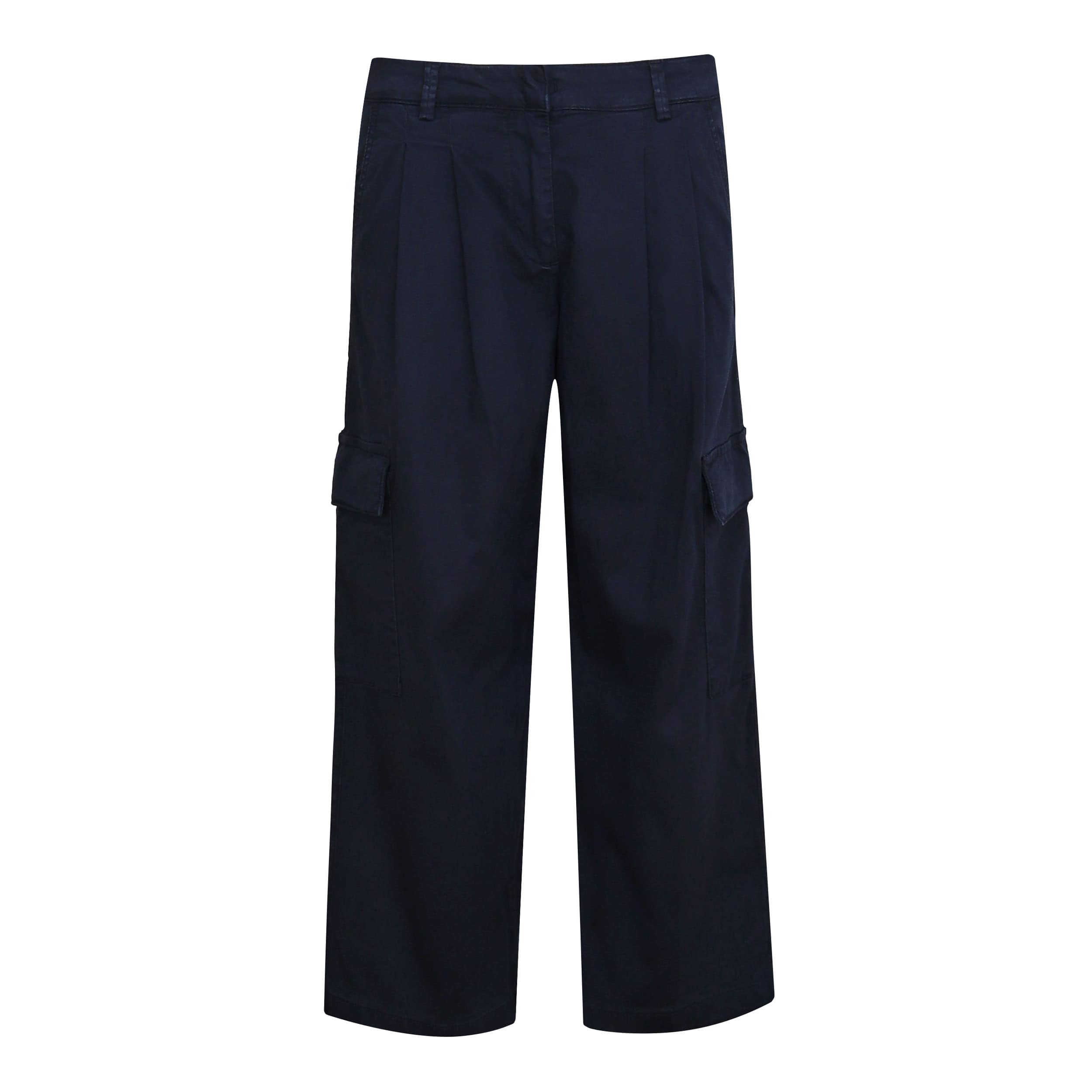 Donkerblauwe pantalon van Milano Italy in navy. Deze broek is gemaakt van stretch stof bestaande uit een mix met lyocell en heeft rechte, wijde broekspijpen met cargo zakken. De pantalon sluit met een haakje, knoop- en ritssluiting, heeft twee steekzakken en twee achterzakken.