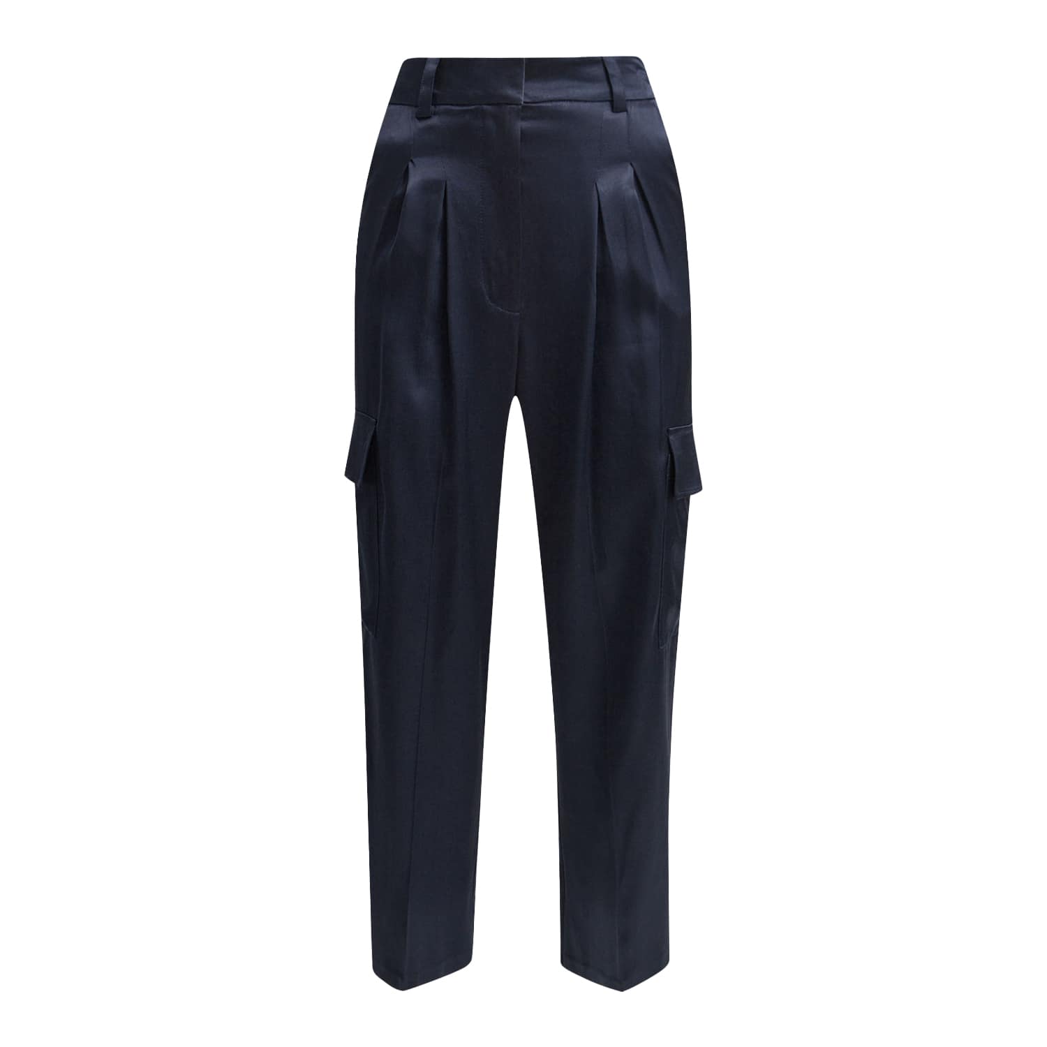 Donkerblauwe satijnen pantalon van Milano Italy. Deze broek is gemaakt van een donkerblauwe, satijnen stof en heeft rechte broekspijpen met cargo zakken. De pantalon sluit met een haakje, knoop- en ritssluiting, heeft twee steekzakken, twee paspelzakken en een geplooide taille.
