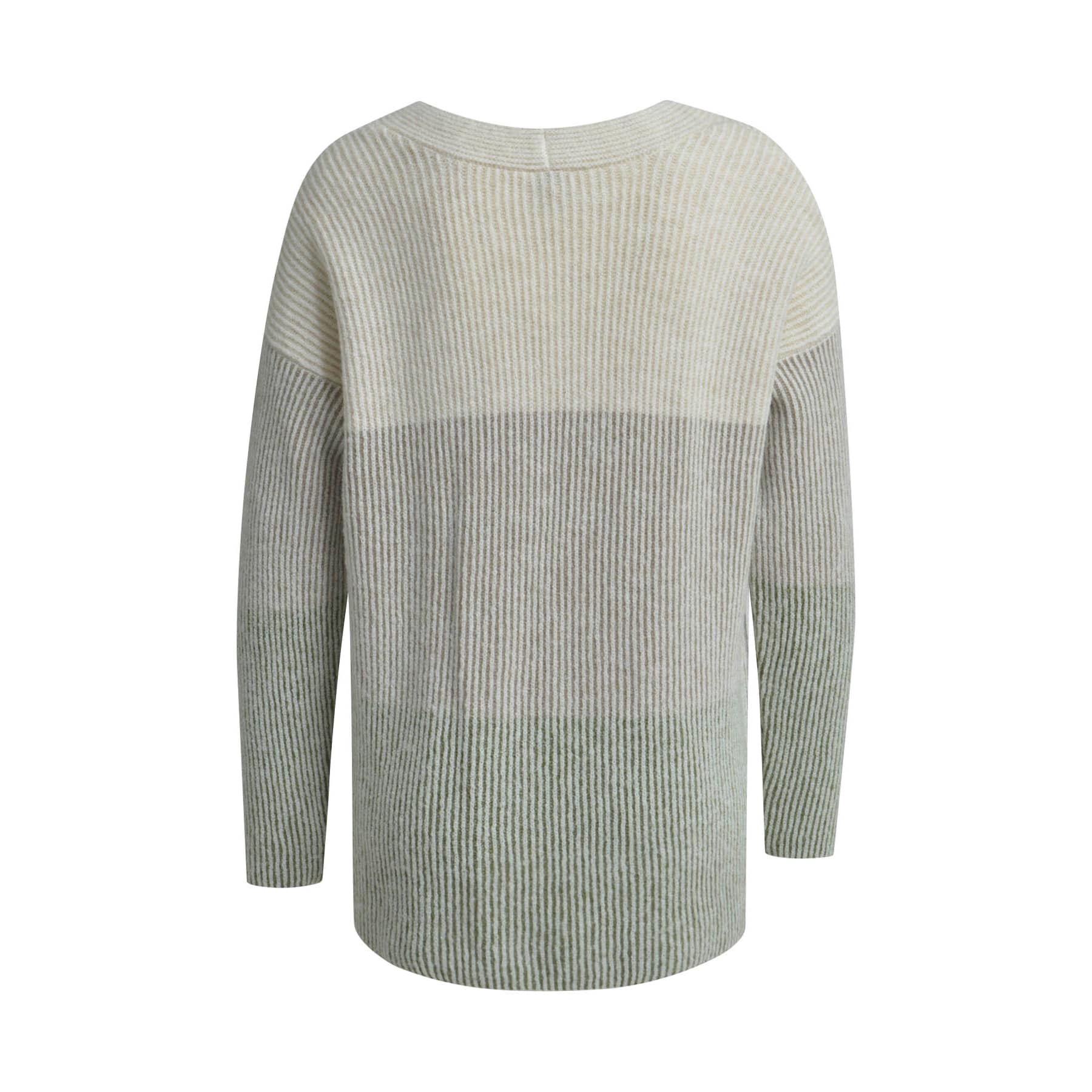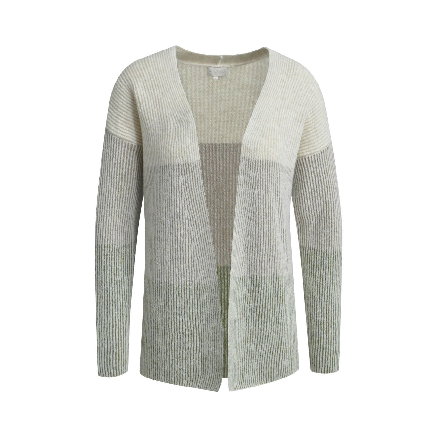 Gestreepte cardigan van Milano Italy. Dit gebreide vest is gemaakt van een mix met alpaca wol en heeft witte verticale strepen over groen, bruin en ecru vlakken. Het vest heeft een openvallende voorzijde en een relaxte pasvorm.