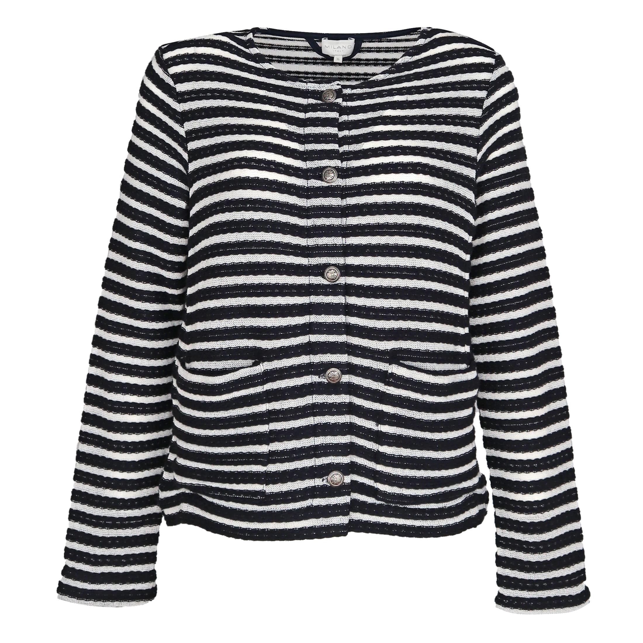 Gestreepte cardigan van Milano Italy in navy print. Dit vest heeft een fijngebreide structuur met donkerblauwe strepen. Het vest heeft lange mouwen, sluit met een knoopsluiting aan de voorzijde, heeft twee steekzakken en een losse pasvorm.