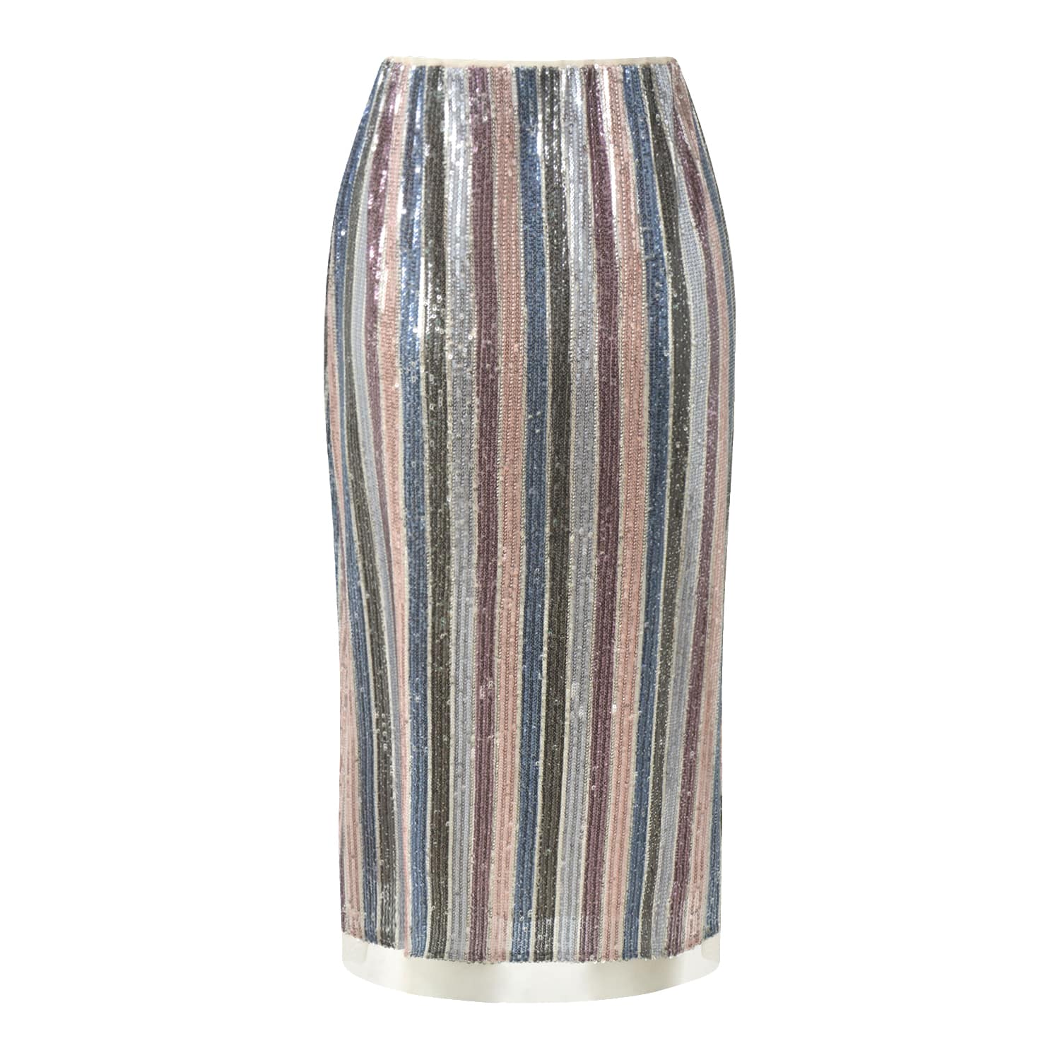 Gestreepte rok van Milano Italy. Deze rok is gevoerd en geheel bezet met verschillende kleuren pailletten, zoals roze, blauw en grijs, met aan de onderzijde een strook tule. De rok heeft een elastische taille, rechte pasvorm en valt over de knie.