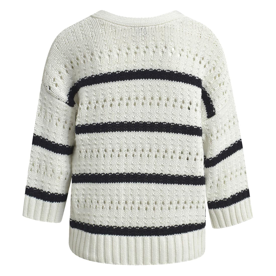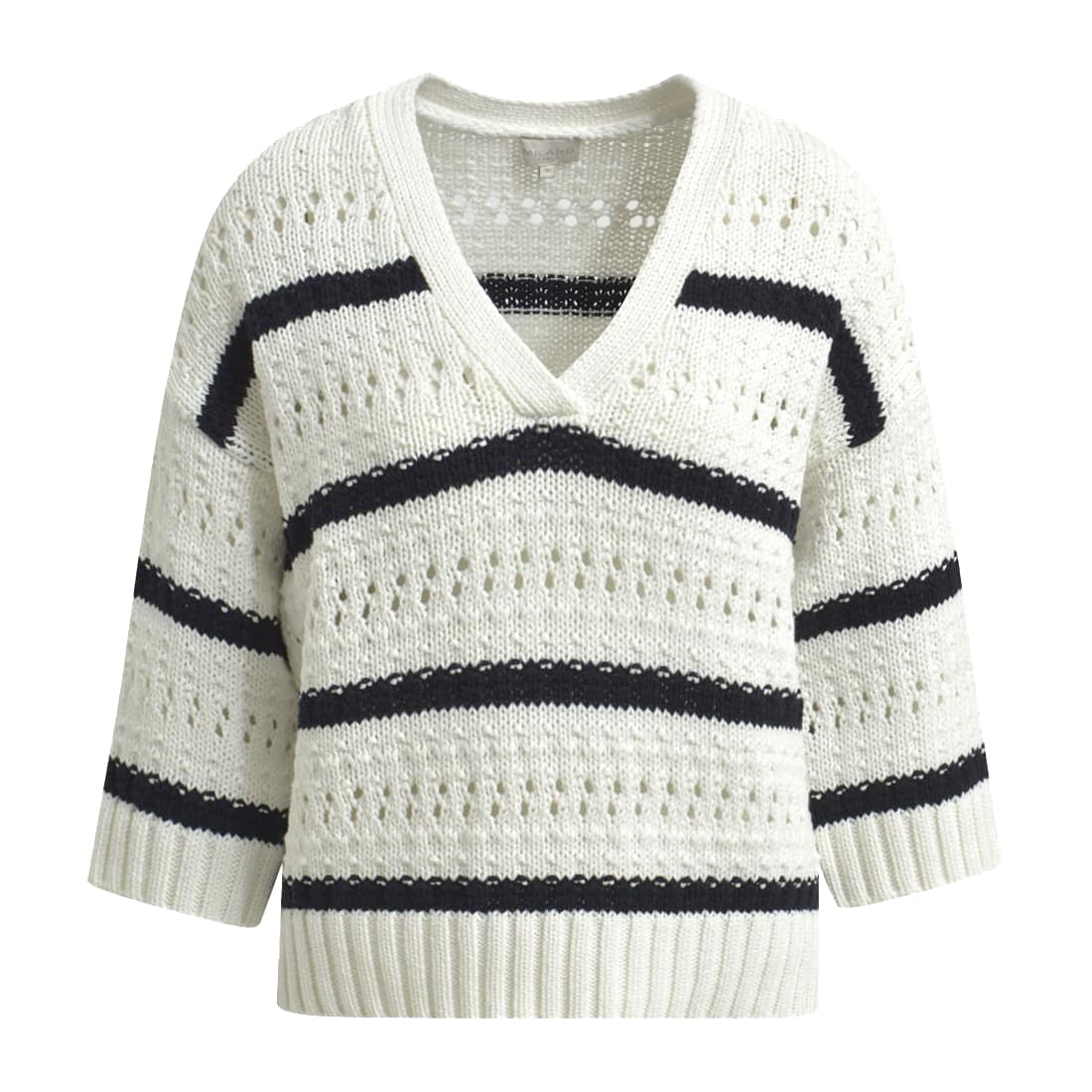 Gestreepte pull van Milano Italy in navy print. Deze trui is gemaakt van een katoen mix en heeft een opengebreide structuur met donkerblauwe strepen. De trui heeft driekwart mouwen, een V-hals en normale pasvorm.