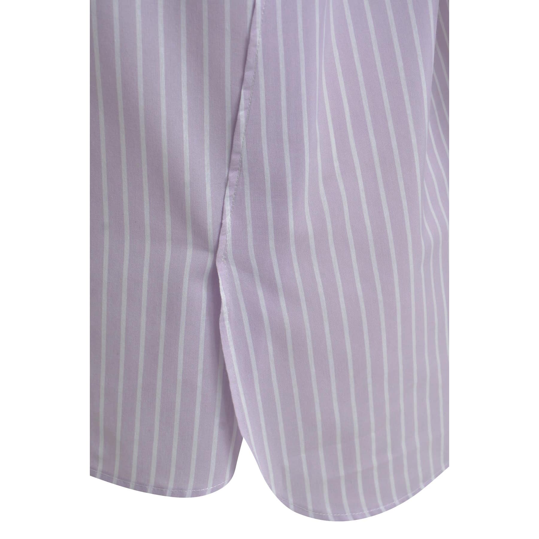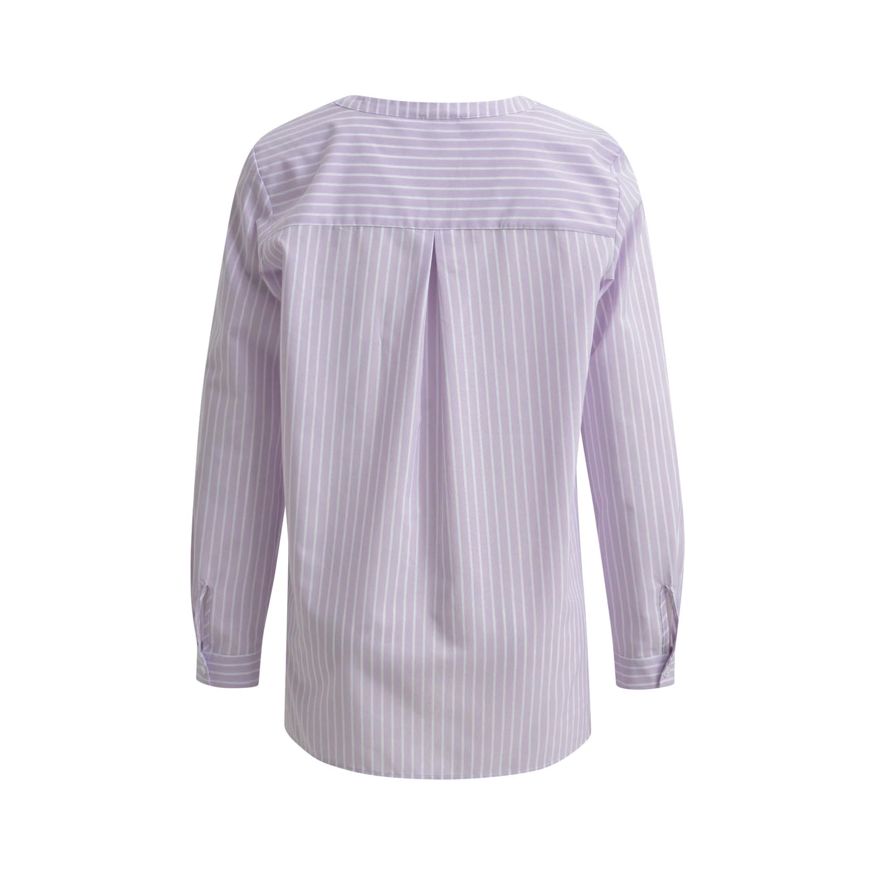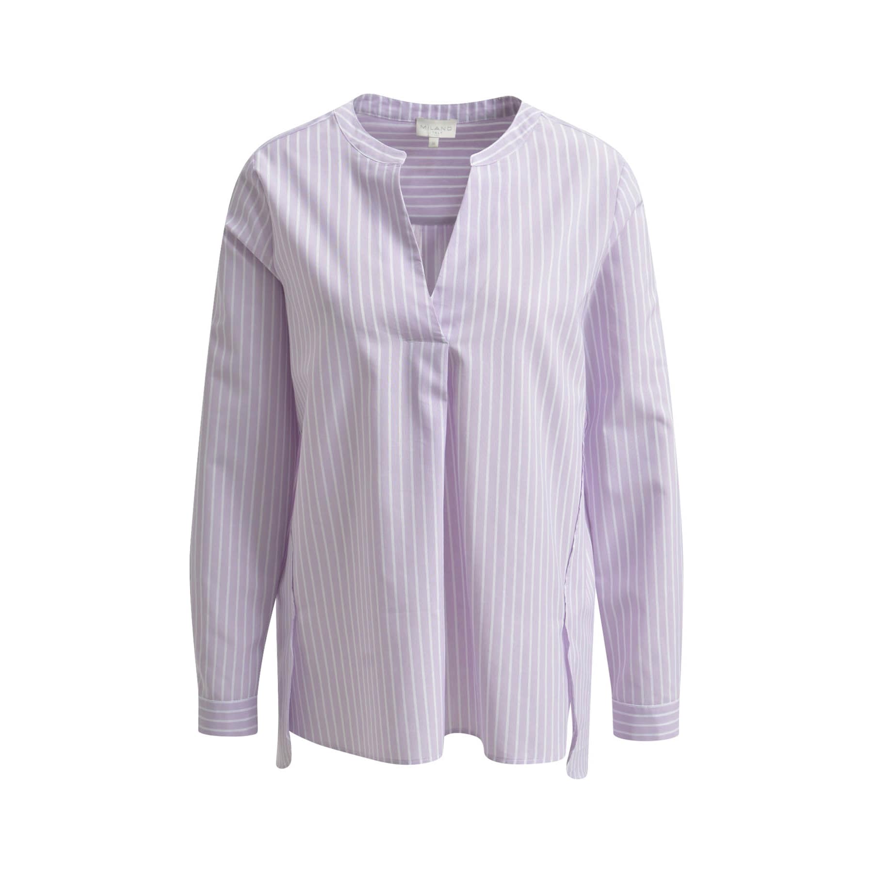Gestreepte, lila tuniek van Milano Italy in violet print. Deze blouse is gemaakt van een katoen mix met een lila met wit gestreept motief en heeft een V-hals met een plooi. De tuniek heeft lange mouwen, los vallende pasvorm en splitjes aan beide zijkanten.