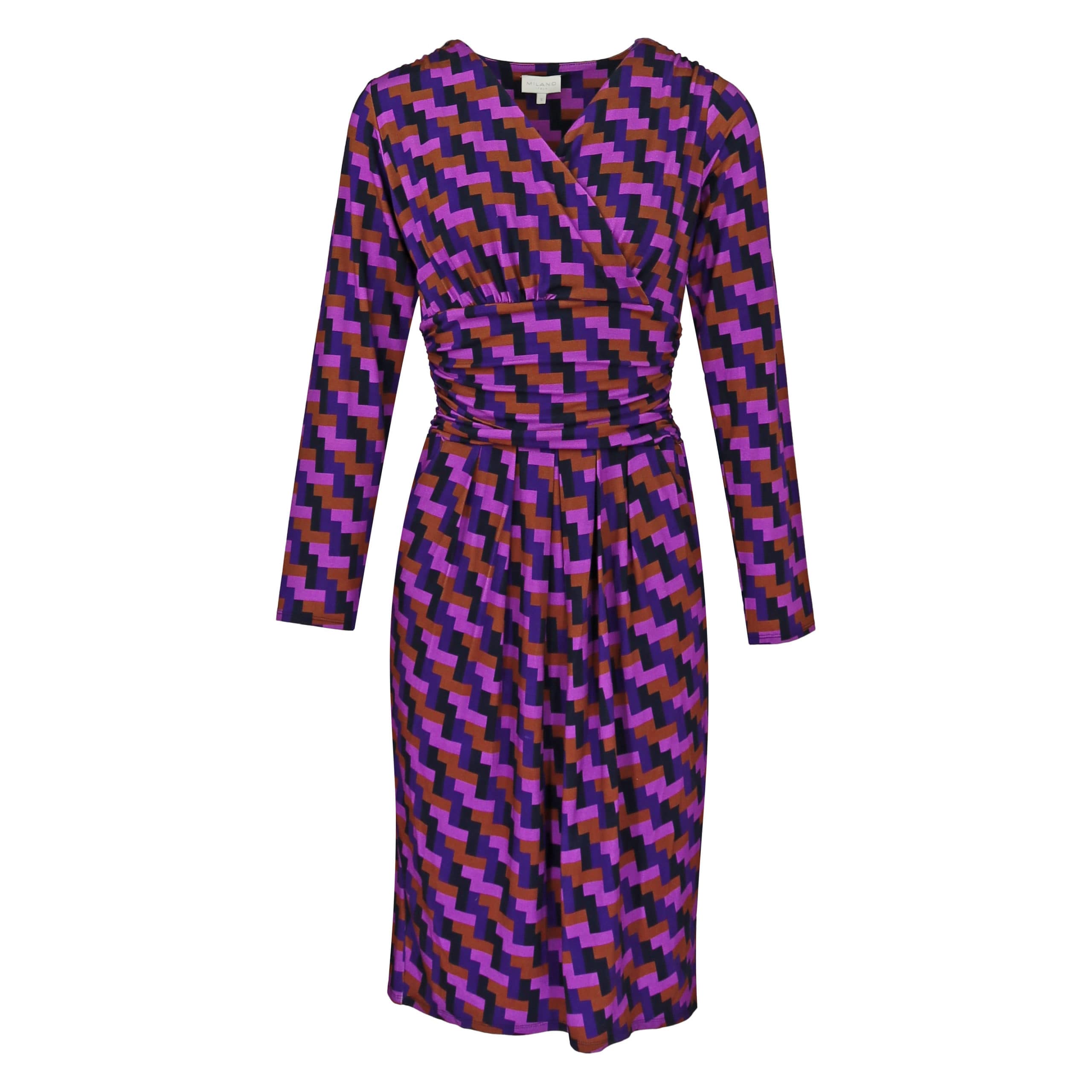 Getailleerd kleedje van Milano Italy. Deze jurk heeft een overslag body met een geplooide aansluitende taille  en valt op de knie. De jurk is gemaakt van een viscose stretch stof met een paars, roze en bruine blokjes print, heeft twee steekzakken en lange mouwen.