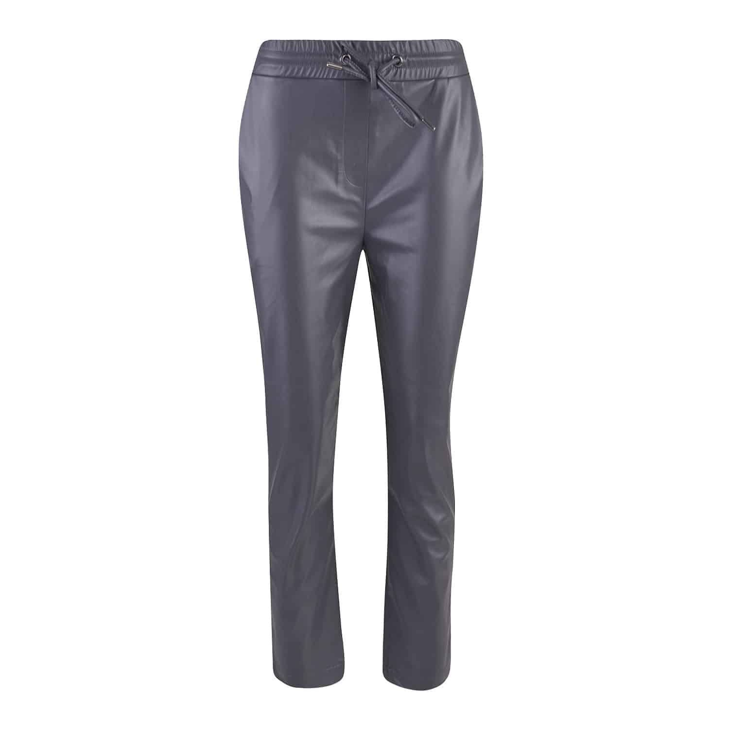 Donkergrijze pantalon van Milano Italy. Deze jogging broek is gemaakt van een leerlook stof en heeft een normale pasvorm met licht toelopende broekspijpen. De broek heeft een elastische tailleband met een trekkoord, twee steekzakken en twee sier paspelzakken.