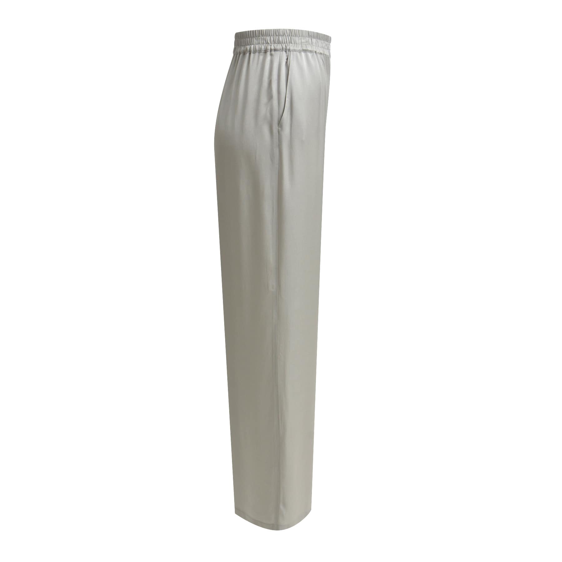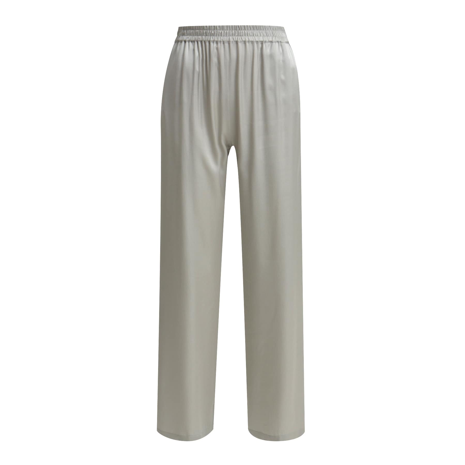 Grijze satijnen pantalon van Milano Italy. Deze broek is gemaakt van een zwarte satijnen stof en heeft wijde, rechte broekspijpen. De pantalon heeft een elastische taille, twee steekzakken en valt lang.