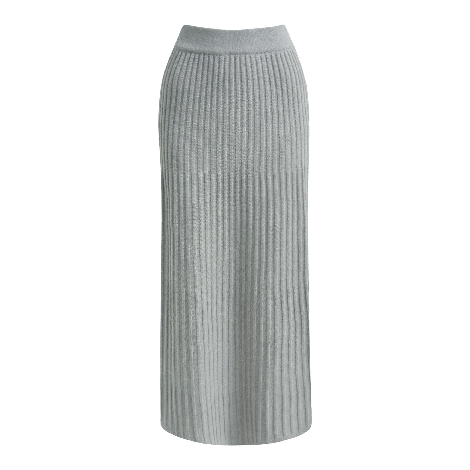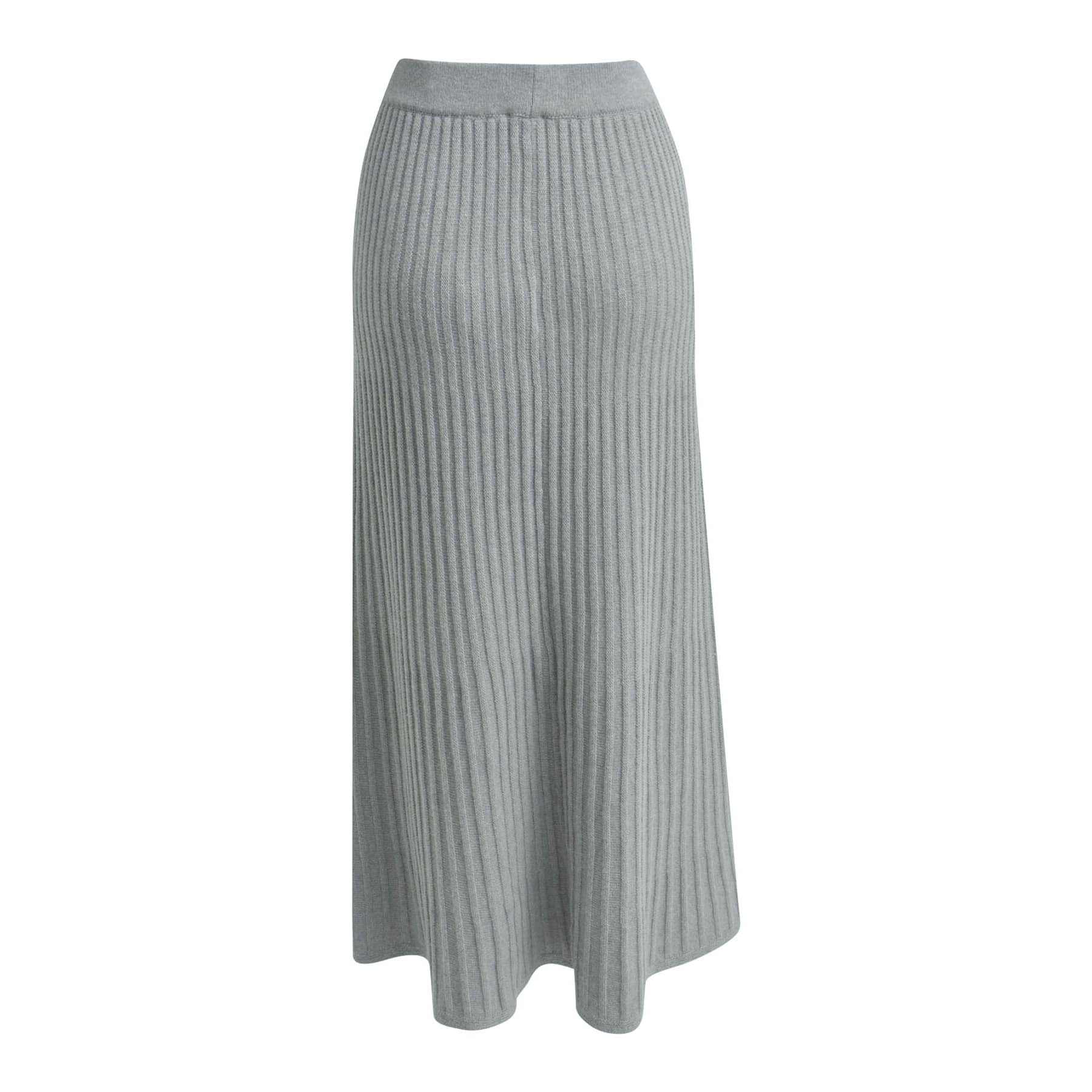 Grijze gebreide midi rok van Milano Italy. Deze rok is gemaakt van een fijn gebreide stretch stof met een gestreept relief in een wol met kasjmier mix en valt boven de enkels. De rok heeft een elastische tailleband en rechte pasvorm.