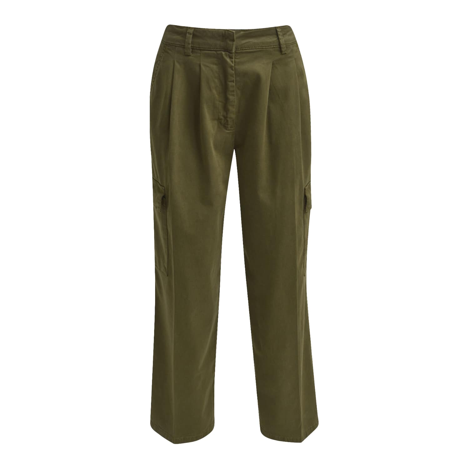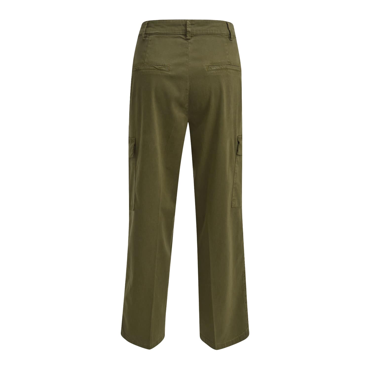 Relaxte cargo pantalon van Milano Italy in olijf. Deze 7/8 broek is gemaakt van een mix met lyocell en heeft een losse pasvorm met wijde rechte broekspijpen. De pantalon sluit met een haakje, knoop- en ritssluiting, heeft twee steekzakken, twee sier paspelzakken en twee cargo zakken.